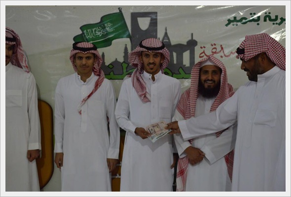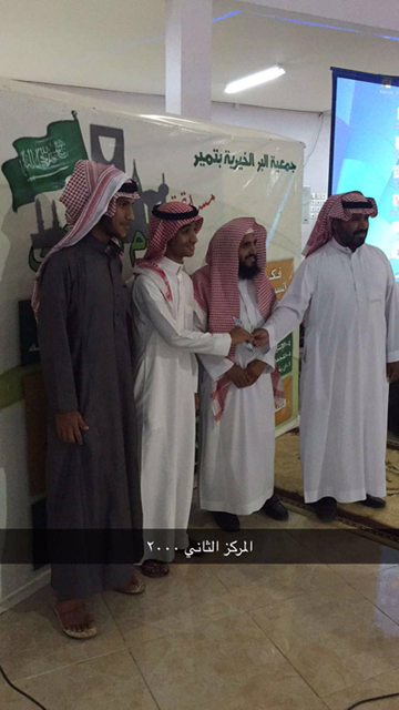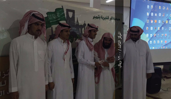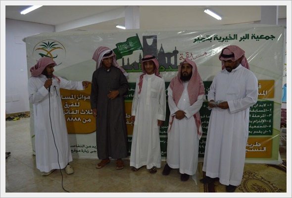 قام نائب رئيس جمعية البر الخيرية بتمير الاستاذ /فهد بن حمد السلطان بتسليم جوائز الفرق الثلاث الفائزه في مسابقة اخدم ديني ووطني مغرب يوم الاثنين بنادي الحي المركز الاول مبلغ وقدرة (3000)ريال المركز الثاني مبلغ وقدرة (2000)ريال المركز الثالث مبلغ وقدرة (1200)ريال والله ولي التوفيق  |
