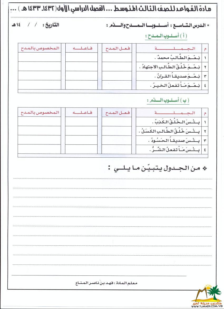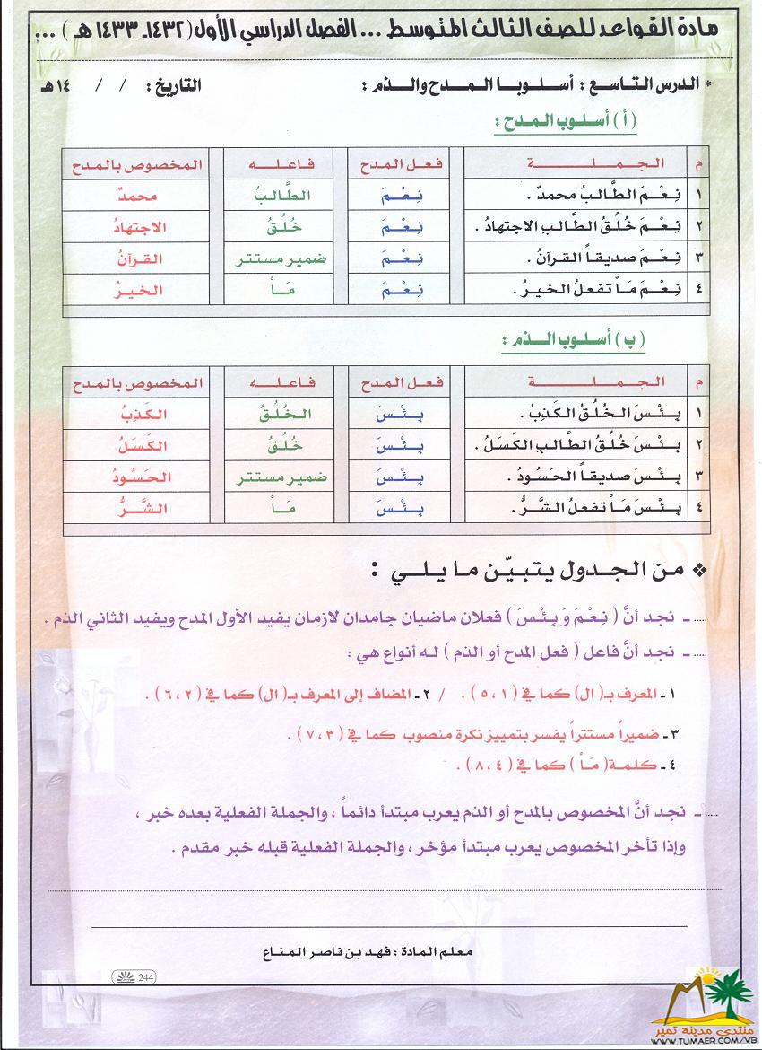 دروس في مـادة القواعد للصف الثالث المتوسط   للفصل الدراسي الأول ( 1432 ـ 1433 هـ ): الدرس الـتــاســـع: أســـلـــوبــا الـمــدح والـــذم :  أتمنى أن تكون واضحة وميسرة  نسعى دائماً لكل ما هو مفيد وشافي بإذن الله ؛ لأجل لغتنا الجميلة والخالدة لـغـــــــــة الـقــرآن الـكــريـــم أخوكم فهد المناع أبو بسام