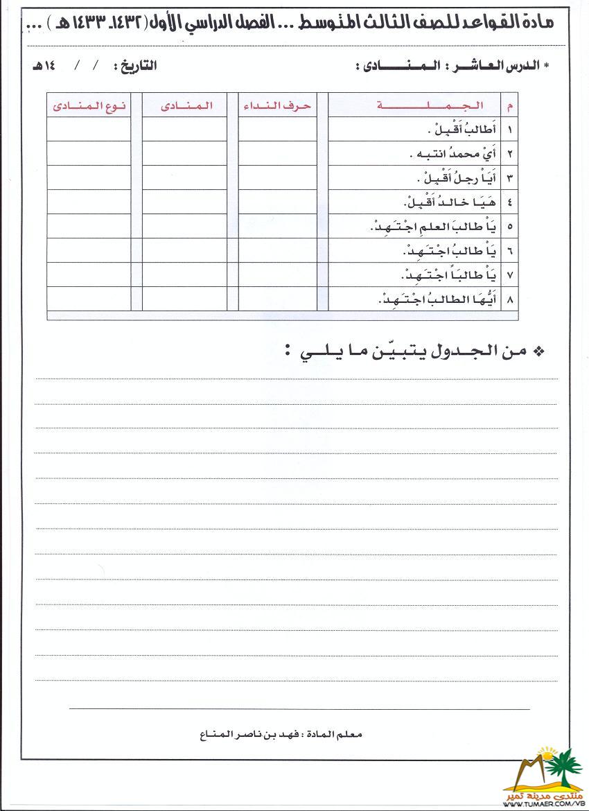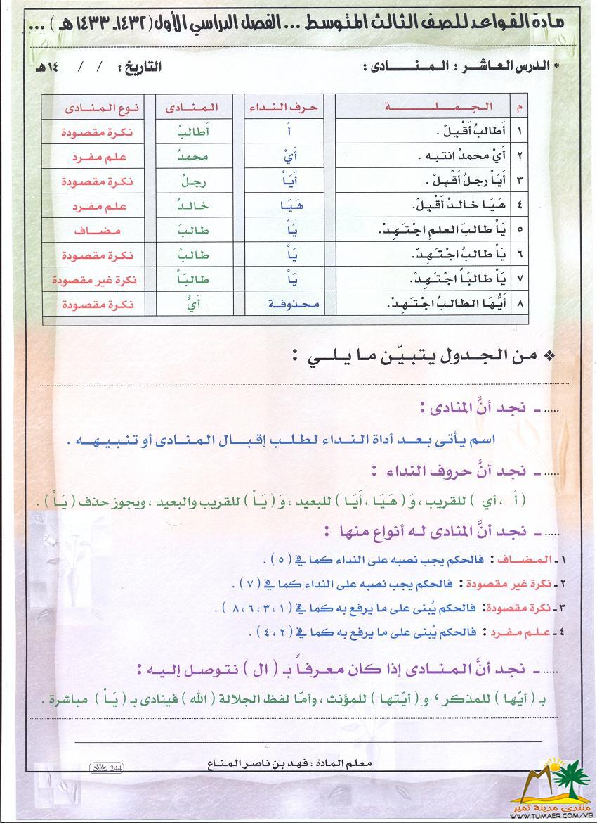 دروس في مـادة القواعد للصف الثالث المتوسط   للفصل الدراسي الأول ( 1432 ـ 1433 هـ ): الدرس الـعــاشـــر: الـمــنـــــــادى :  أتمنى أن تكون واضحة وميسرة  نسعى دائماً لكل ما هو مفيد وشافي بإذن الله ؛ لأجل لغتنا الجميلة والخالدة لـغـــــــــة الـقــرآن الـكــريـــم أخوكم فهد المناع أبو بسام  </U></I>