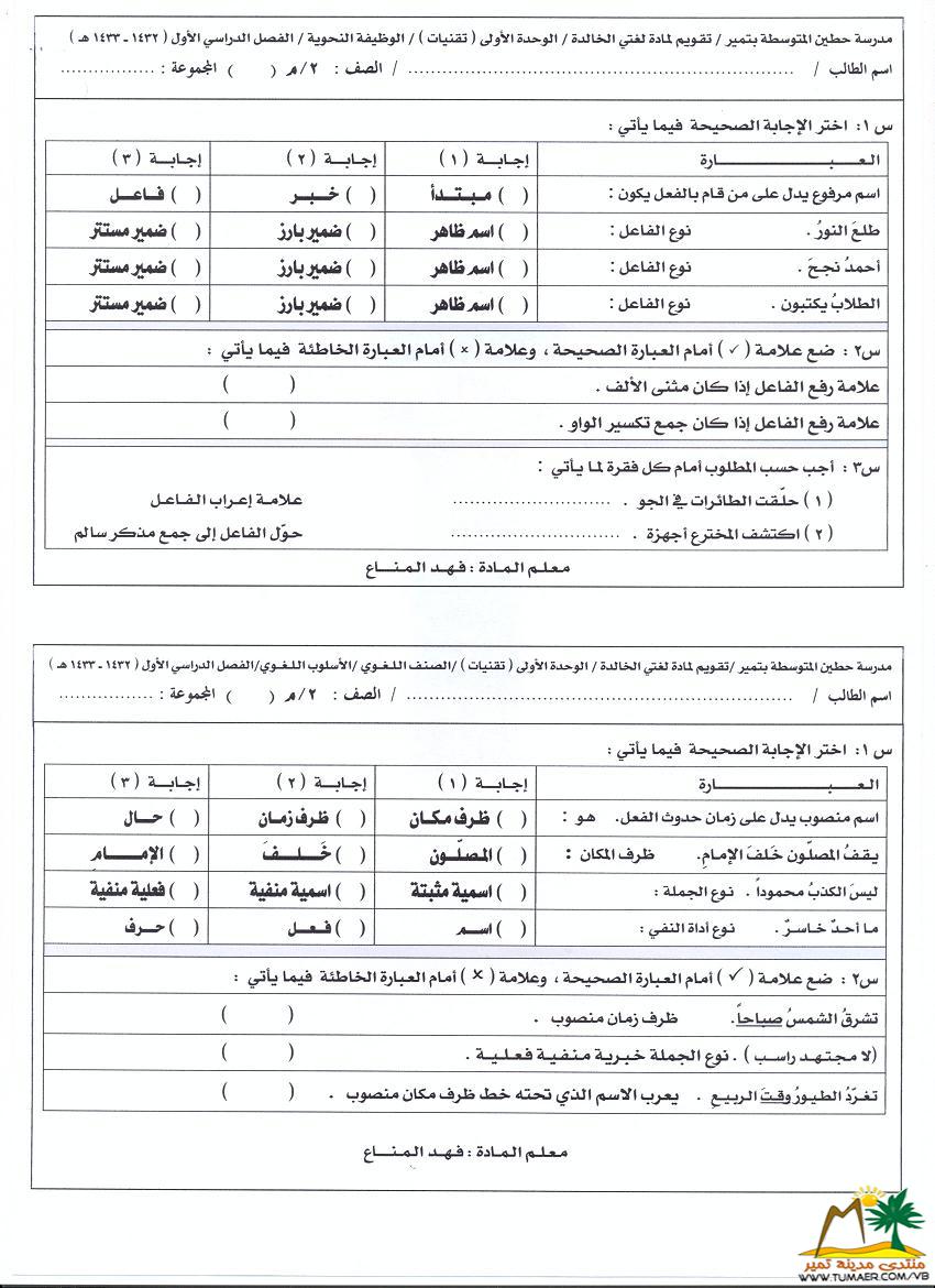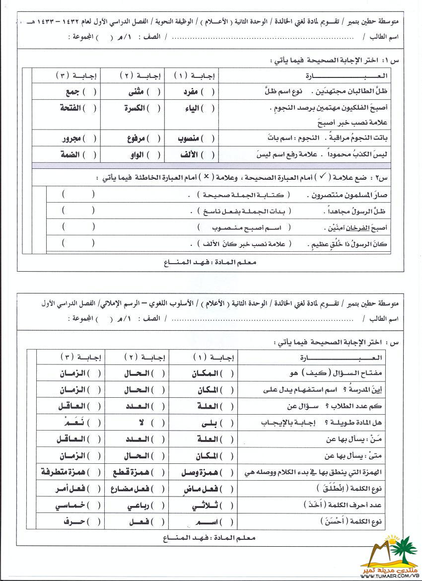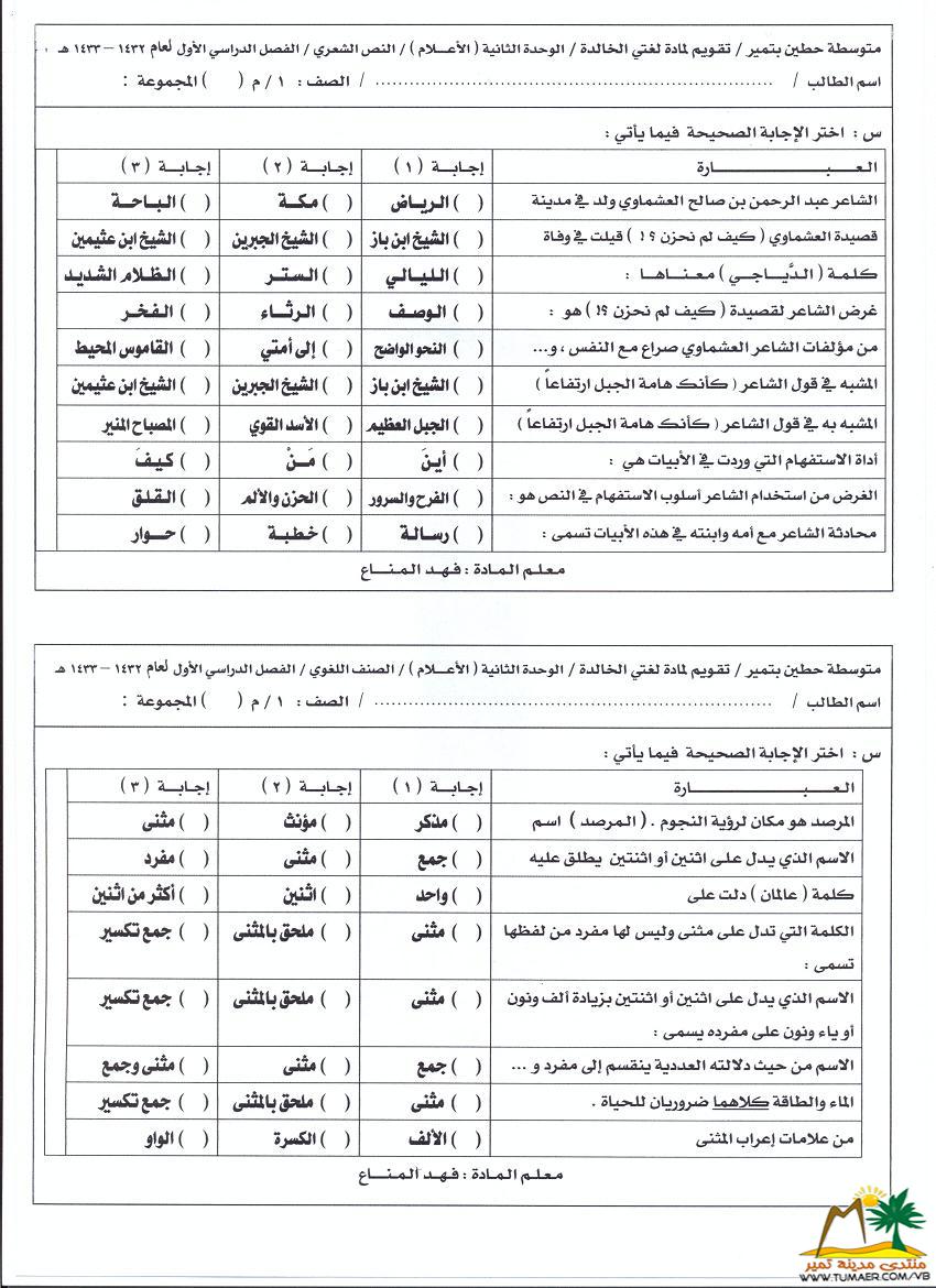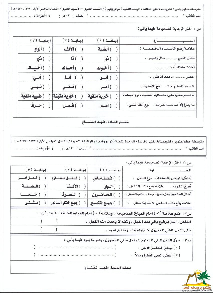 تقويم مادة لغتي الخالدة للصف الثاني المتوسط ( الوحدة الثانية )   للفصل الدراسي الأول ( 1432 ـ 1433 هـ ):  |