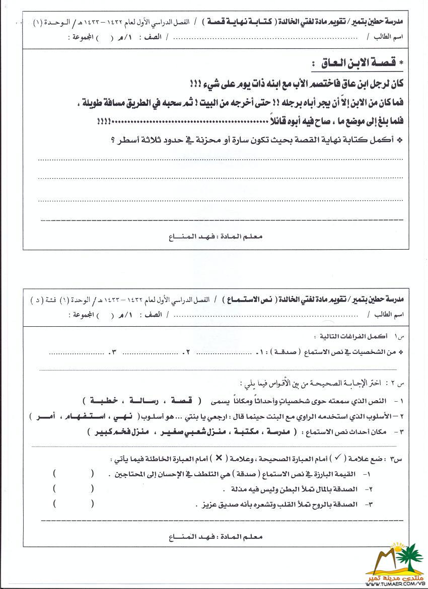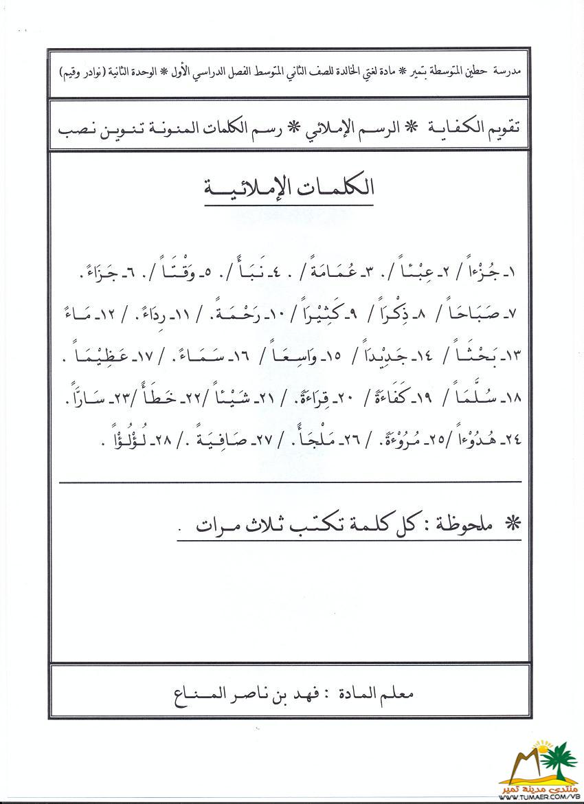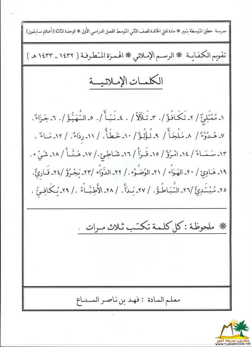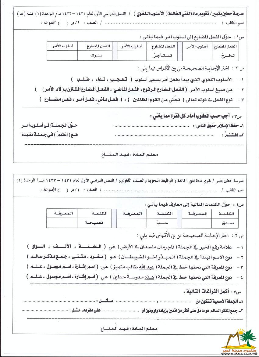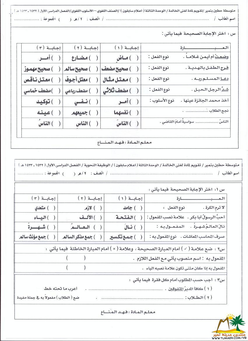 تقويم مادة لغتي الخالدة للصف الثاني المتوسط ( الوحدة الثانية )   للفصل الدراسي الأول ( 1432 ـ 1433 هـ ):  |