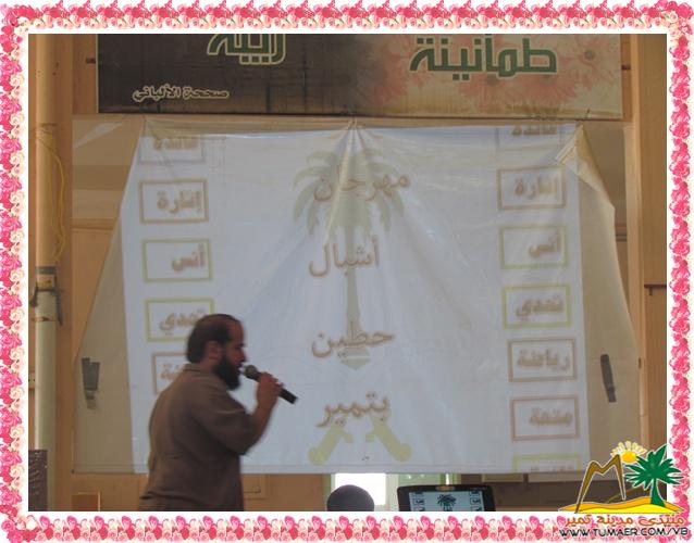 في يوم جميل يغمره الفرح والسعادة بنسيمه العليل أشرقت شمس مدرسة حطين بتمير صباح يـوم الـثـــلاثــاء الـثـالـث عـشـر من شهر محــرم لعام أربـعـة وثـلاثـيـن وأربع مئة وألف للهجرة اليوم المفتوح المنوع والممتع بقائدها التربوي الأستاذ القدير غالب بن محمد الفيصل وذلك على مرحلتين : المرحلة الأولى : طلاب المرحلة الابتدائية في مقر المدرسة في الساحة الداخلية بقيادة الأستاذ المبدع سلوم بن إبراهيم السلوم ببرنامج منوع ممتع فريد من نـوعـه حـفـل بمسابقات ومفاجآت رسمت البسمة على وجيه الطلاب. المرحلة الثانية : طلاب المرحلة المتوسطة ، وذلك في ساحة المدرسة الخـارجـيـة ببرنامج فريد من نـوعـه( مخيم المراجل ) على أربع مجموعـات ( التجارة ، التراث ، الزراعة ، التقنية ) أثبتت من مسماها رجال أسود حطين بفعلهم في ساحة المخيم إعداداً وتجهيزاً للـقـهـوة والإفـطــار، وتقييم أفضل طبخ . وكان من ضمن البرامج كل مخيم يحمل مسماه حيث التنافس والإثارة و التحدي، وتقييم أفضل مخيم يحمل مسماه. ومن ضمن البرامج نشاط رياضي وثقافي . نترككم الآن مع التغطية والتقرير المصور لليوم المفتوح : الـسـاحـة الـداخـلـيـــــة : </I> </B> الساحة الخـارجية ( مخيم المراجل ) : إعــداد الـقــهـــوة و الـشــاي وتـنـاولهـمـا : إعــداد وجــبــة الإفــطــار وتـنـاولهــا : يتبع ... |