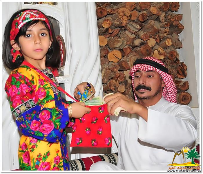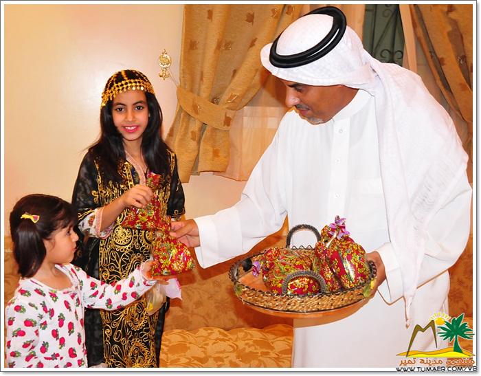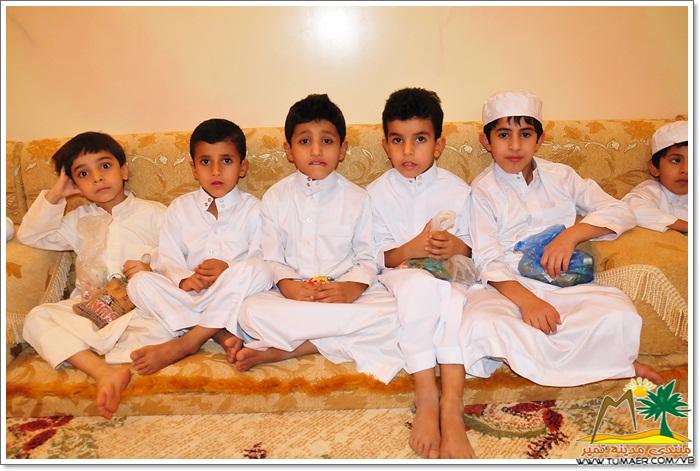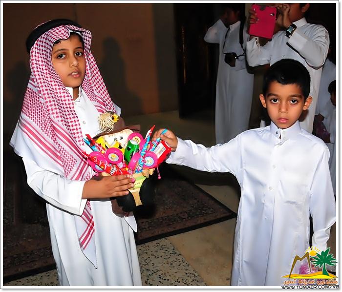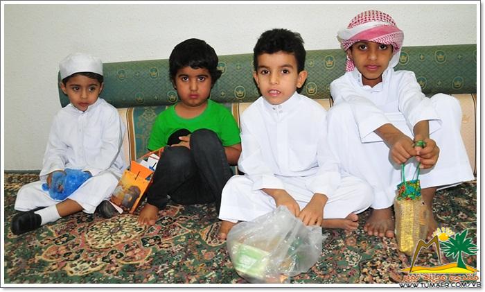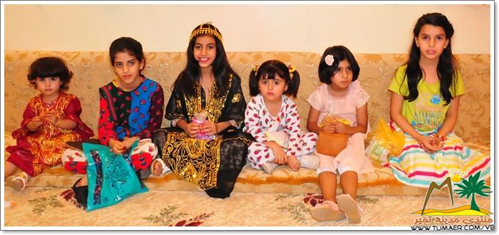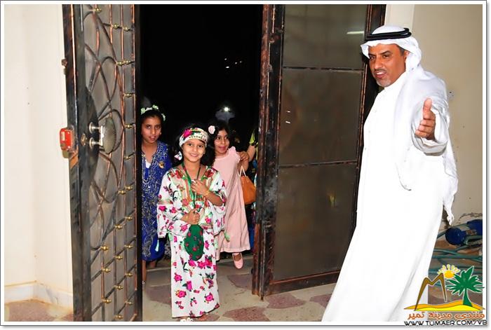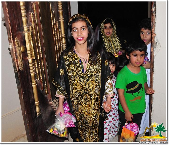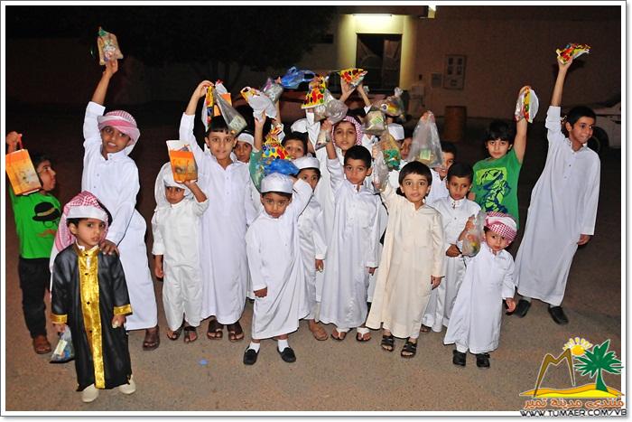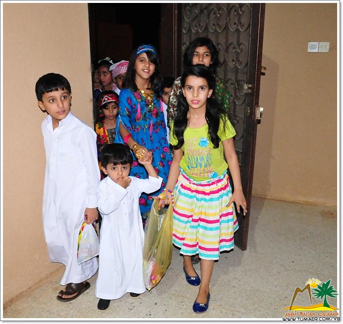 (( الحُوامة ))  العام الماضي كانت بداية إعادة ( موروث اندثر مع التقدم والتطور )  وهذا العام تم إحياء هذا الموروث للسنة الثانية وسوف نعيد المادة التحريرية الذي طرح العام الماضي لما فيها من المعلومات والكلمات التي تقال بهذه المناسبة والعادة السنوية قبل العيد :: ::  تقبل الله منا ومنكم الصيام والقيام وصالح الأعمال  مع قرب أيام عيد الفطر المبارك يتخلد للذهن والفكر تلك الأيام الجميلة بالسعادة   والفرح التي اختفت في وقتنا هذا .. فلم يعد الفرح بقرب العيد كما كان بالماضي ولكن  السعادة والفرح بقدوم العيد لا يزال في محيا شفاه الأطفال وينتظرون قدومه بفارغ الصبر ..  :: ::  (( الحُوامة )) لقب أُطلق على الطريقة التي يحتفل بها الأطفال بمناسبة العيد حيث حصل على مسمى ذلك  إلهاماً من كون الأطفال يحومون على البيوت الموجودة في الحي . كان الأطفال من بنات وأولاد يلبسون ثيابهم ويأخذون أكياس ويطقون ( يطرقون ) على البيوت الأولاد يلبسون  ثياب والطواقي الزري ويأخذون أكياس كل واحد ماسك يد أخته وهم يرددون عند كل بيت: أبي عيدي عادت عليكم .. من حال زينه .. جعل الفقر ما يدخل عليكم ولا يكسر رجليكم ولا يديكم جعلكم تعودنه  هالزمان وكل زمان (( نشد الحمير ولا نسوقه )) إذا قالوا أهل البيت شدوه يعني وقفوا راح يعطونهم وإذا قالوا سوقوه يعني ما رح يعطونهم .. فردوا عليهم الأطفال: جعل الفقر يجيكم ويكسر رجليكم !!؟ وإذا أعطوهم ردوا قائلين : جعل الفقر مايجيكم ولا يكسر رجليكم. ومع اندثار هذه العادة ونسيانها .. وفي جو مفعم بأجواء العيد والفرح والسعادة اعاد أطفال و أبناء حارتنا مساء هذا  اليوم الثلاثاء الموافق . 28 / 9 /1434هـ هذه العادة للسنة الثانية فطافوا بيوت الحارة طارقين ابوابها لإحياء تراث ماضي وزمن جميل بمدينتنا الغالية تمير .. :: ::  في هذا اليوم شاركنا في هذا الموروث مجموعة بسيطة من الأطفال   فقد سعدنا بمشاركتهم الأولى لهذا الموروث العريق  |
