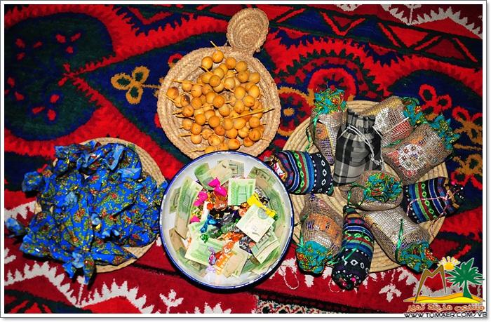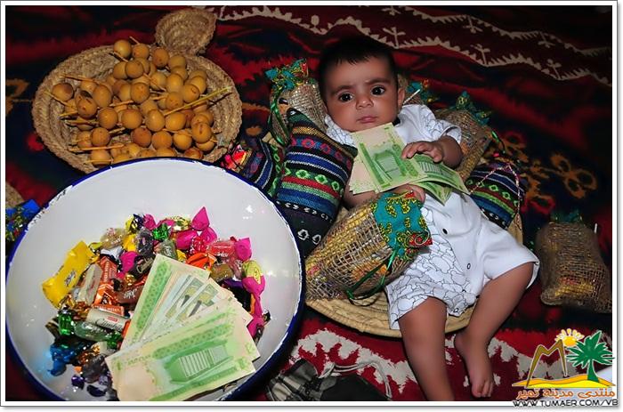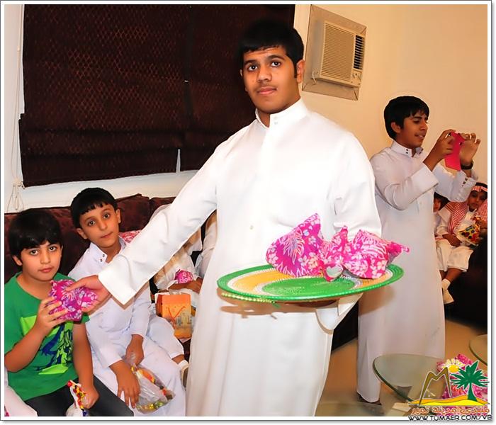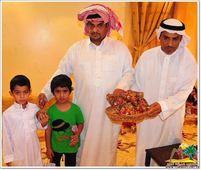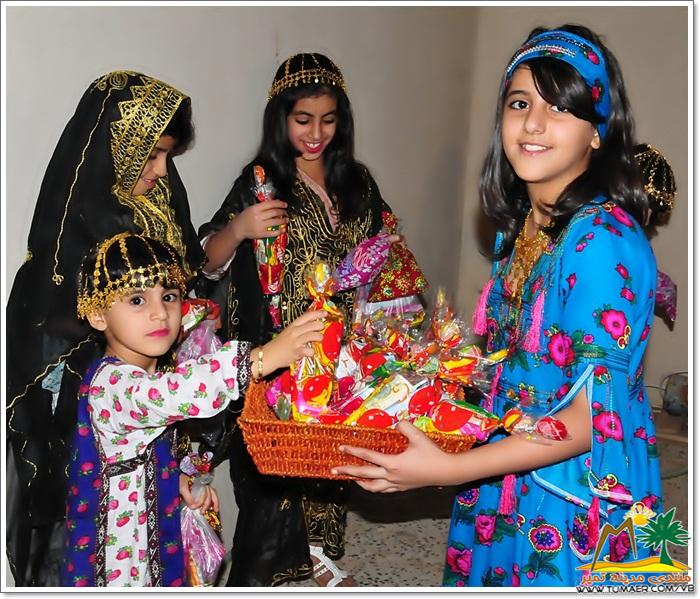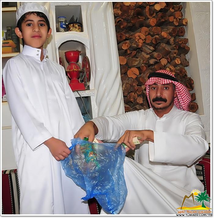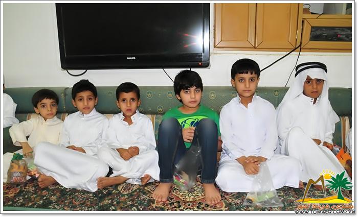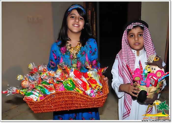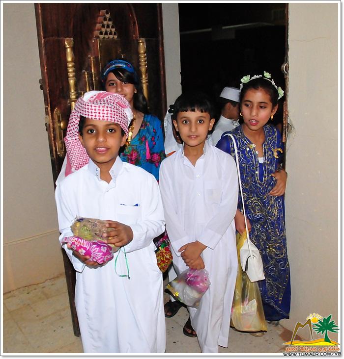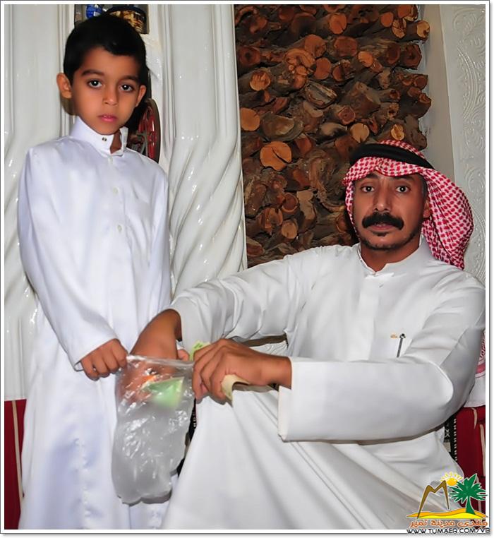 (( الحُوامة ))  العام الماضي كانت بداية إعادة ( موروث اندثر مع التقدم والتطور )  وهذا العام تم إحياء هذا الموروث للسنة الثانية وسوف نعيد المادة التحريرية الذي طرح العام الماضي لما فيها من المعلومات والكلمات التي تقال بهذه المناسبة والعادة السنوية قبل العيد :: ::  تقبل الله منا ومنكم الصيام والقيام وصالح الأعمال  مع قرب أيام عيد الفطر المبارك يتخلد للذهن والفكر تلك الأيام الجميلة بالسعادة   والفرح التي اختفت في وقتنا هذا .. فلم يعد الفرح بقرب العيد كما كان بالماضي ولكن  السعادة والفرح بقدوم العيد لا يزال في محيا شفاه الأطفال وينتظرون قدومه بفارغ الصبر ..  :: ::  (( الحُوامة )) لقب أُطلق على الطريقة التي يحتفل بها الأطفال بمناسبة العيد حيث حصل على مسمى ذلك  إلهاماً من كون الأطفال يحومون على البيوت الموجودة في الحي . كان الأطفال من بنات وأولاد يلبسون ثيابهم ويأخذون أكياس ويطقون ( يطرقون ) على البيوت الأولاد يلبسون  ثياب والطواقي الزري ويأخذون أكياس كل واحد ماسك يد أخته وهم يرددون عند كل بيت: أبي عيدي عادت عليكم .. من حال زينه .. جعل الفقر ما يدخل عليكم ولا يكسر رجليكم ولا يديكم جعلكم تعودنه  هالزمان وكل زمان (( نشد الحمير ولا نسوقه )) إذا قالوا أهل البيت شدوه يعني وقفوا راح يعطونهم وإذا قالوا سوقوه يعني ما رح يعطونهم .. فردوا عليهم الأطفال: جعل الفقر يجيكم ويكسر رجليكم !!؟ وإذا أعطوهم ردوا قائلين : جعل الفقر مايجيكم ولا يكسر رجليكم. ومع اندثار هذه العادة ونسيانها .. وفي جو مفعم بأجواء العيد والفرح والسعادة اعاد أطفال و أبناء حارتنا مساء هذا  اليوم الثلاثاء الموافق . 28 / 9 /1434هـ هذه العادة للسنة الثانية فطافوا بيوت الحارة طارقين ابوابها لإحياء تراث ماضي وزمن جميل بمدينتنا الغالية تمير .. :: ::  في هذا اليوم شاركنا في هذا الموروث مجموعة بسيطة من الأطفال   فقد سعدنا بمشاركتهم الأولى لهذا الموروث العريق  |