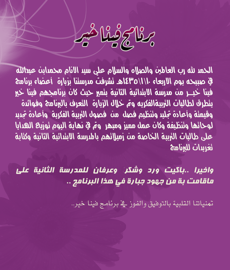كل الشكر للمدرسه الثآنيه على جهودها المبآركه ..