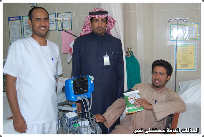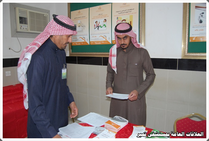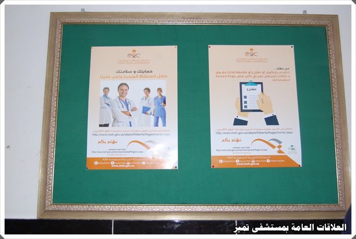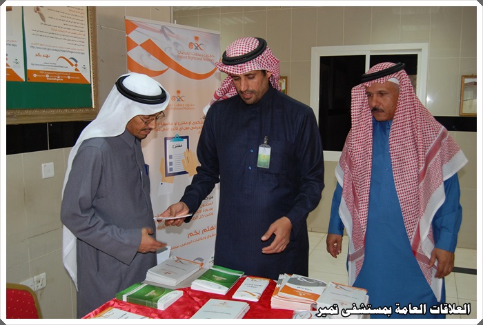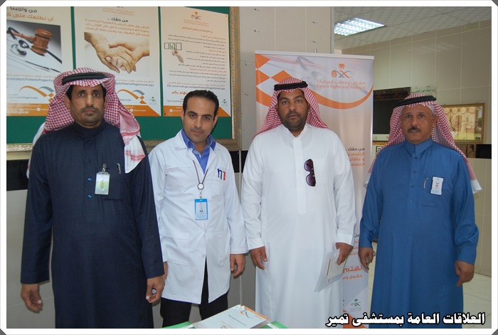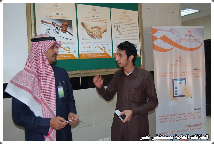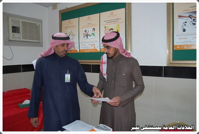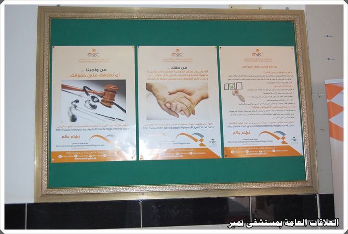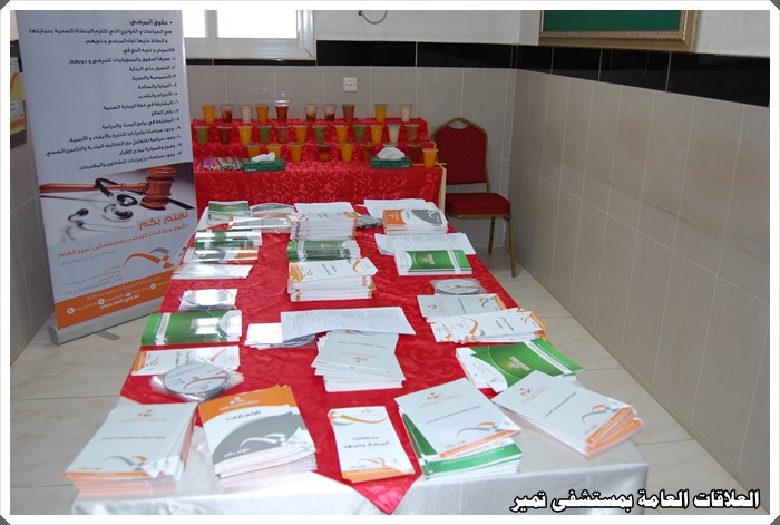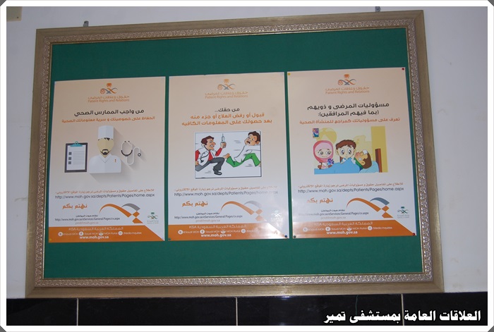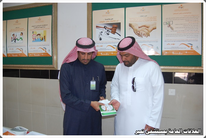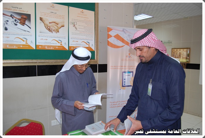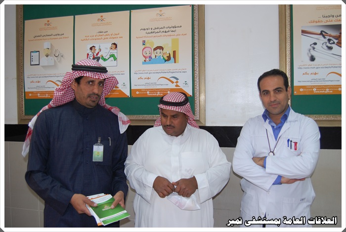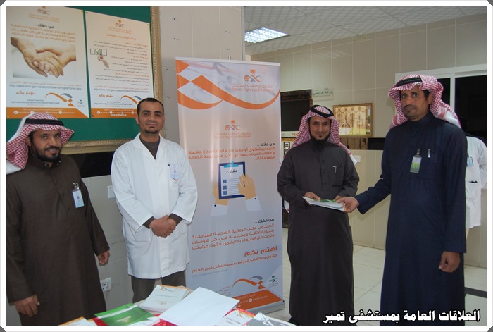العلاقات العامة بمستشفى تمير  دشن مدير مستشفى تمير العام بالنيابة الأستاذ عبدالله المنيع المعرضَ التثقيفي الذي أقامته إدارة حقوق وعلاقات المرضى بمستشفى بمستشفى تمير، بمناسبة اليوم الخليجي لحقوق المريض، والذي ينظم هذا العام تحت شعار (( المريض اولاً )) بحضورالمدير الطبي بمستشفى تمير الدكتور محمد الحمود ورئيس قسم إدارة حقوق وعلاقات المرضى بمستشفى تمير الأستاذ حسين التمامي ،وقد احتوى المعرض على مطويات ونشرات ووثائق توضح حقوق ومسؤوليات المرضى . وقدم مدير حقوق وعلاقات المرضى الأستاذ حسين التمامي إلى شرح عن الخدمات المقدمة للمرضى ومدى تحسينها وتطورها , وأوضح التمامي أنه تمت زيارة المرضى بقسم الطوارئ والتنويم للاطمئنان على سلامتهم وصحتهم، وسؤالهم عن رضاهم بالخدمات الطبية والصحية المقدمة لهم، وتقديم المطويات والمنشورات وذلك ضمن فعاليات هذا اليوم. .. ..  |