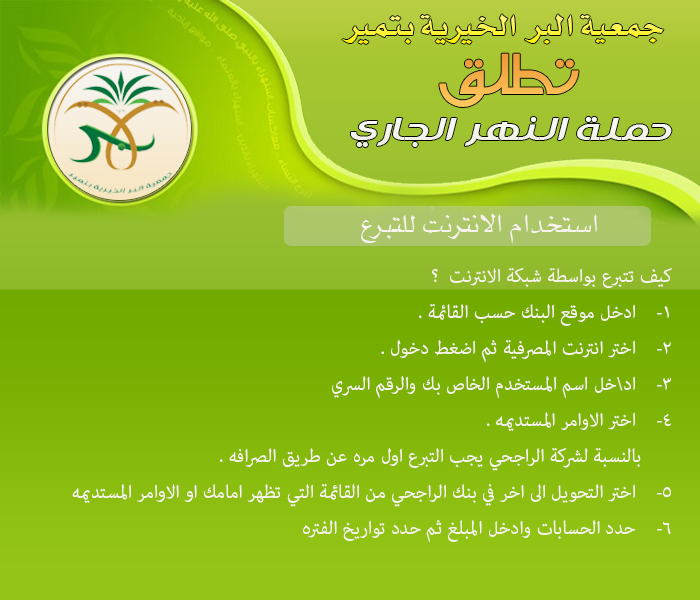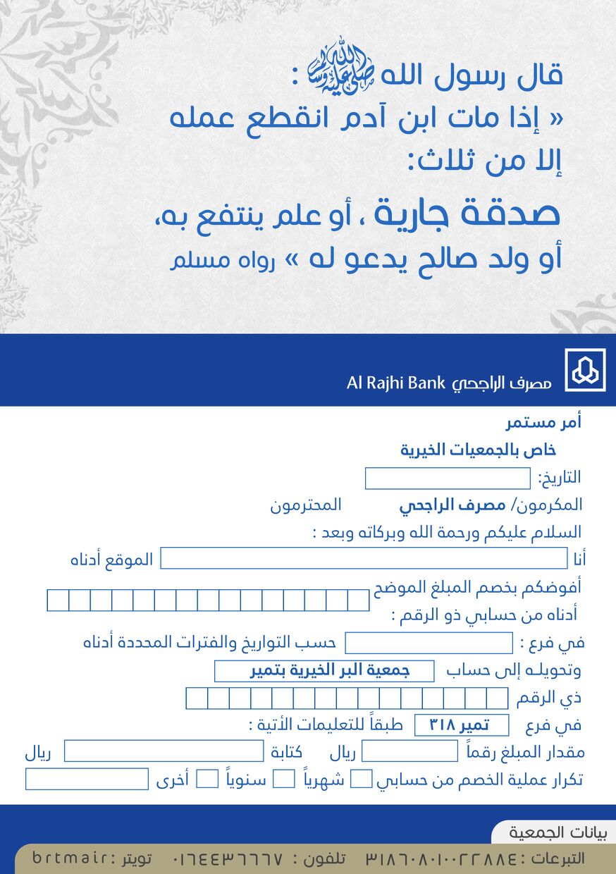 ومضاعفاتها فلا تبخل على نفسك أنفق ابن ادم ينفق عليك عن أبي هريرة إلا من ثلاثة إلا من صدقة جارية أو علم ينتفع به أو ولد صالح يدعو له طريقة التبرع: - الذهاب للبنك وتعبئة نموذج الامر المستديم لديهم . أو - التوجه للجمعية وتعبئه نفس النموذج . للاستفسار الاتصال على موظف الجمعية ابو احمد جوال : 0541333220 صور توضح النوذج وطريقة تفعيل الامر المستديم ملاحظه هامه : من الضروري أن يكون التوقيع على الامر المستديم مطابق للتوقيع المعتمد في البنك  |