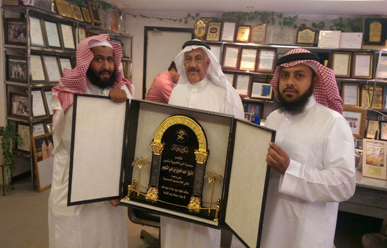 مع الجمعية وفي نهاية الزيارة تم تكريم الشيخ عبدالعزيز الشويعر بدرع تذكاري