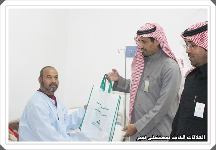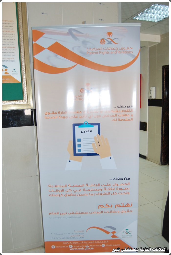 دشن مدير مستشفى تمير العام الأستاذ بجاد الحمراني, المعرضَ التثقيفي الذي أقامته إدارة حقوق وعلاقات المرضى بمستشفى تمير العام، وذلك بمناسبة اليوم الخليجي لحقوق المريض والذي ينظم هذا العام تحت شعار ( نهتم بكم ) بحضور مساعد المدير الأستاذ عبدالله المنيع ومدير إدارة حقوق وعلاقات المرضى بمستشفى تمير الأستاذ حسين التمامي , الذي قدم شرحا عن الخدمات المقدمة للمرضى ومدى تحسينها وتطورها, موضحا أنه تمت زيارة المرضى بقسم الطوارئ والتنويم للاطمئنان على سلامتهم وصحتهم، وسؤالهم عن رضاهم بالخدمات الطبية والصحية المقدمة لهم، وتقديم المطويات والمنشورات وذلك ضمن فعاليات هذا اليوم .