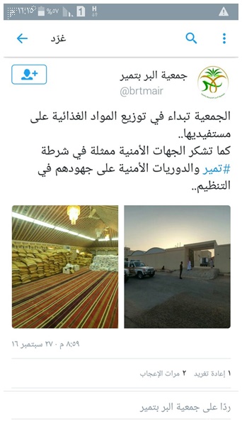 قامت جمعية البر الخيرية بتمير بتوزيع مجموعه من المواد الغذائية للمسجلين بجمعية البر الخيرية الجدير بالذكر انه قد تم توزيع مايلي : سكر رز شاي طحين وبلغ عدد المستفيدين تقريبا 280 مستفيد والله ولي التوفيق |
