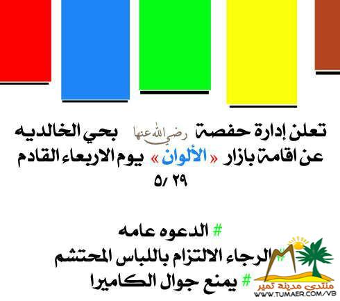 بسم الله الرحمن الرحيم في مساء يوم الإربعاء 29 / 5 تزينت دار حفصة رضي الله عنها بحي الخالدية بحلة الألوان واكتست زواياها بألوان الربيع المشرقة بازار الألوان بدت فكرة وبين تعب وجهد وتفكير أصبحت واقع جميل في مساء ذو رونق خاص .. إليكم تغطية ذلك اليوم الرائع ،، اللون الأخضر اللون الأزرق اللون الأصفر اللون الأحمر اللون البني ( الشعبي ) |