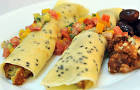 المكونات للكريب 1 بيض 2/1 كوب دقيق 2/1 كوب حليب 1 ملعقة صغيرة حبة البركة 1 ملعقة صغيرة زيت للحشو خس، شرائح فلافل، قطع باذنجان مقلي، شرائح للتقديم سلطة طحينة مع قطع صغيرة طماطم وخيار وبصل و فلفل ألوان مع قليل من عصير الليمون طريقة التحضير- يُخفق البيض في وعاء عميق مع الدقيق والحليب وحبة البركة، حتى نحصل على خليط متجانس لا توجد به أي كُتل (يُمكن تصفية الخليط بمصفاة سلك للتخلص من الكُتل إن وُجدت). - تُسخن مقلاة على نار متوسطة، وتُدهن بقليل من الزيت. - يُسكب كمية من اخليط، وتُوزع في المقلاة بتحريكها بشكل دائري للحصول على قرص رقيق. - يُترك حتى يُصبح الجانب الملامس للمقلاة ذهبي اللون. - يُرفع على ورق زبد، وتُكرر العملية حتى ننتهي من كل كمية الخليط، مع وضع ورق زبد بين كل قرص وآخر حتى لا تلتصق. - يُوزع الخس على أحد أقراص الكريب، ثم بعض شرائح الباذنجان وقطع الفلافل، ويُلف بشكل أسطواني. - تُرص وحدات الكريب المحشوة في طبق التقديم وتُقدم مع سلطة الطحينة مع الخضروات.
