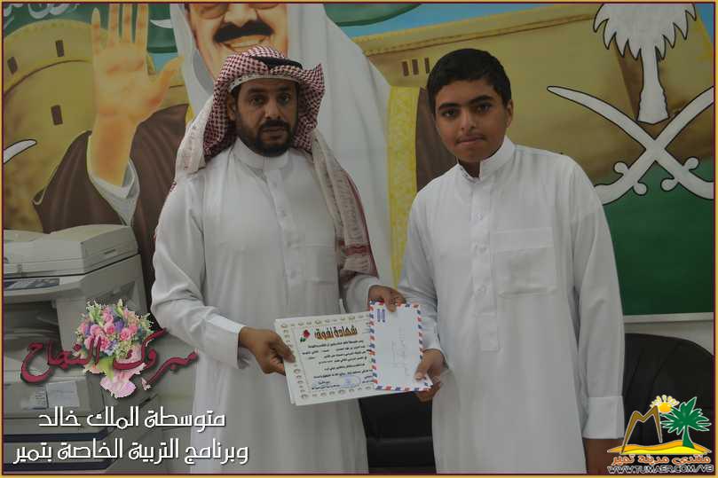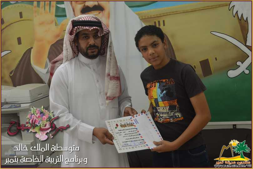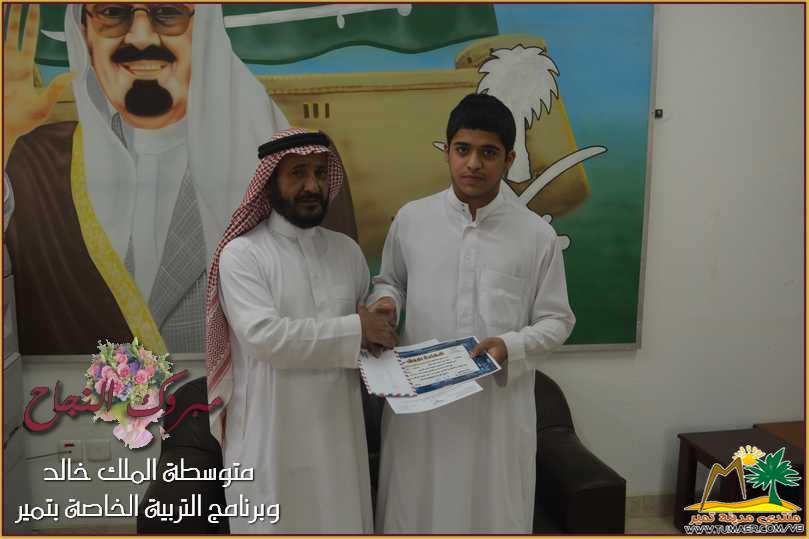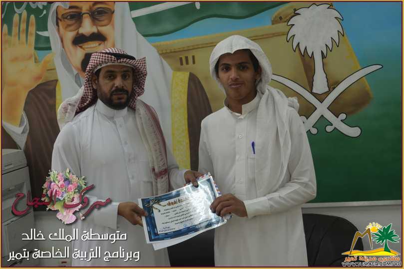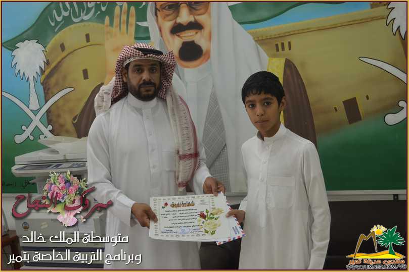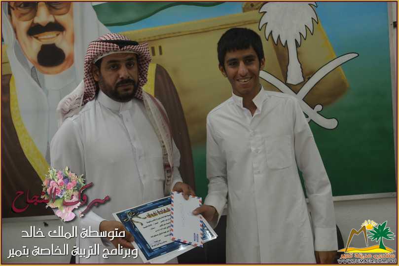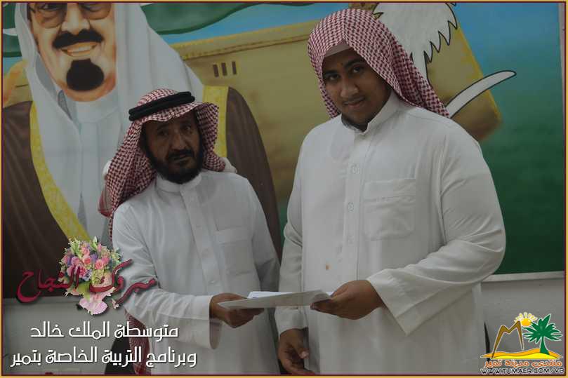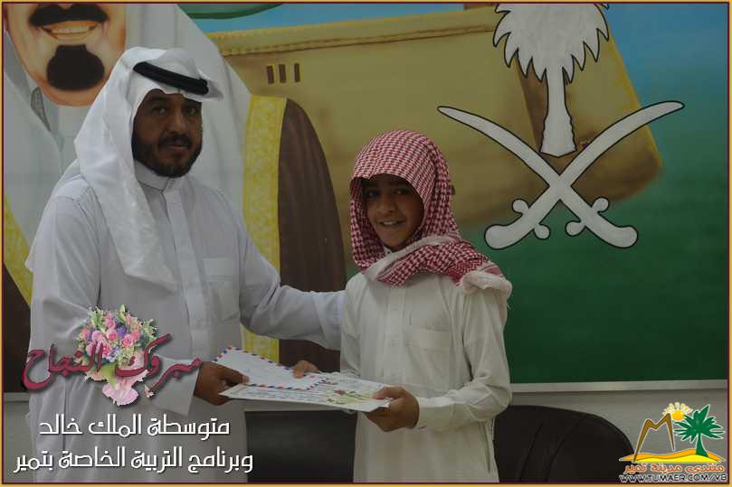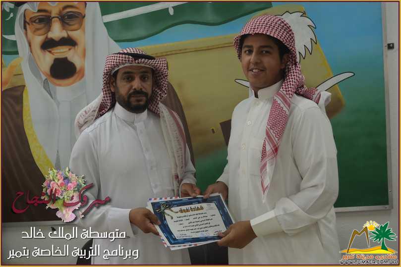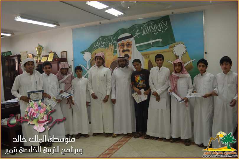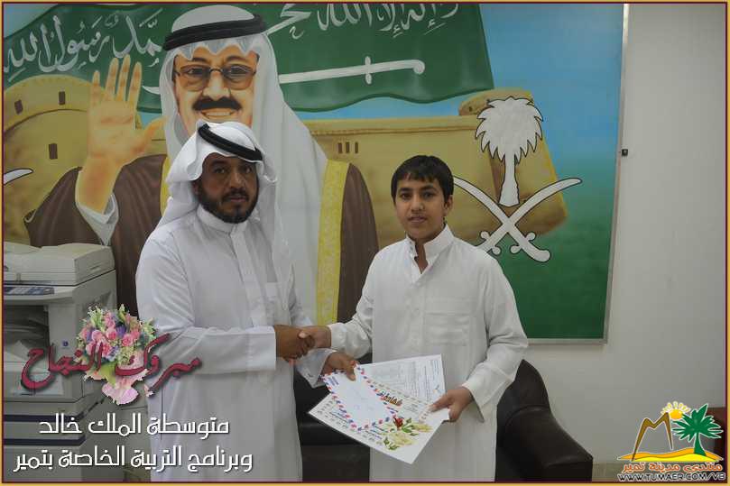 قطاع حكومي   |  تكريم الطلاب المتفوقين للعام الدراسي 1433- 1434هـ  أقيم حفل تكريم للطلاب المتفوقين دراسيًا بمتوسطة الملك خالد وبرنامج التربية الخاصة وفصول الامل بتمير في الفصل الدراسي الثاني للعام 1433-1434هـ بحضور مدير المدرسة الأستاذ / عبدالله عبدالعزيز العبدالله ووكيل المدرسة / احمد عبدالهادي المناع والمرشد الطلابي الأستاذ / عبدالله محمد البرغش وعدد من اولياء الامور والمعلمين . تم في هذا الحفل توزيع شهادات التفوق والجوائز على الطلاب المتفوقين واليكم صور تكريم الطلاب المتفوقين                                                             طالبنا العزيز حفظك الله نبارك لك ولاسرتك هذا التفوق سائلين المولى عزوجل أن ينفع به ويبارك فيه نوصيك بتقوى الله في السر والعلن قال الله تعالى ( لئن شكرتم لأزيدنكم )   |