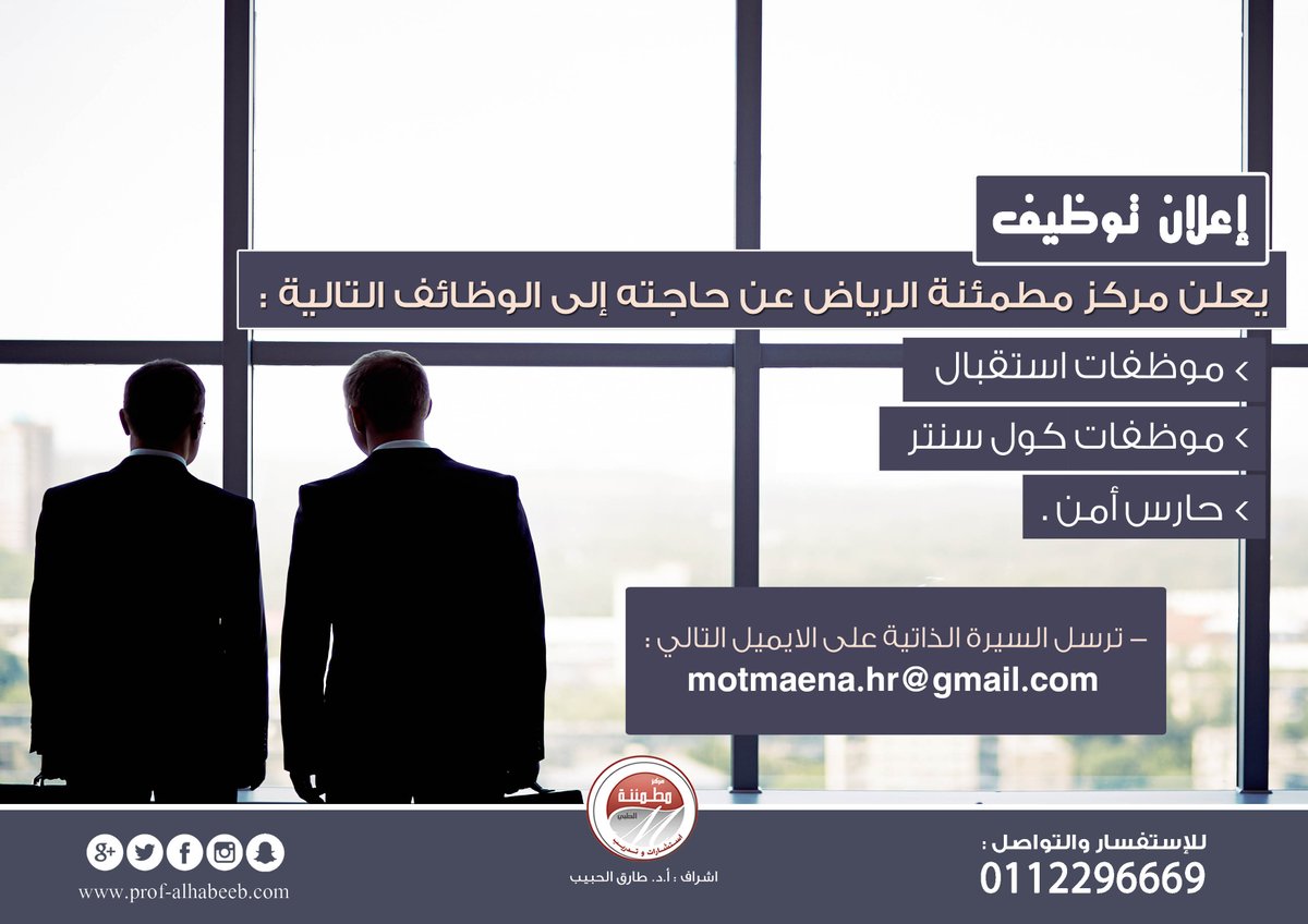2016/12/26 الساعة 12:12 صباحًا - فيالمراسلون, حصاد اليوم, وظائف 6930 0 طباعة ![]() المواطن- خالد الأحمد أعلنت مجموعة مراكز “مطمئنة” للطب النفسي والاستشارات والتدريب والإعلام بالرياض عن حاجته إلى الوظائف التالية: 1- موظفات استقبال. 2- موظفات كول سنتر. 3- حارس أمن. وأوضح المركز، أن على الراغبين في التقديم إرسال السيرة الذاتية على الإيميل التالي:motmaena.hr@gmail.com . وللاستفسارات والتواصل: (0112296669). ![]() |