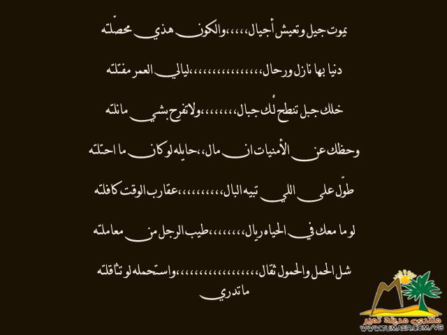 وانا اقـول يبقـى كـان نسلـه علـى ظنّـه ترد اسمه اسبـاعٍ مـا تقنـع بفـات الفـوت مـا تقصـر علـى لـو إنّـه وعـذر لكنّـه ليا مرّ له طـاري تـرد الرجـال الصـوت يامـال الوسـع فالقبـر والعـفـو والجـنّـه ذرى المرجله ماهوب مـال وثـلاث ابيـوت ولاهوب مسـرى الليـل ولا نطحـت الكنّـه في بعض الامور اتعرف بان صاحبك سربوت ويعجبـك واحـد مــا توقعتـهـا مـنّـه وطويل الذراع اللـي شعـر شاربه مسلـوت مثـل حاكـم أكبـر مملكـه منكسـر سنّـه من البرد يقدر يدفـي الجسـم ثـوب وكـوت لكّـن الوجـه لامـن بــرد مــا يدفـنّـه يقولون دايـم والـردي مـا يجيـه المـوت وانا اقـول يفنـى ميـر محـدن درى عنّـه ! |