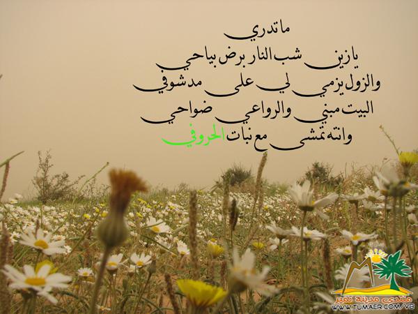 الغصون يهزها الشوق للشوق وتميل ،،،،،،،،،،،،،،،والقلوب ليا غزاهـا الغـلا يحتلهـا والبها والجمر والثلج والرمش الضليل ،،،،،،،،،،،،،،أربع ألغاز صعيبه وصعـب حلهـا مشفي فيها شفاة الفقير مـن البخيـل ،،،،،،،،،،،،أبي هذي وأبي هـذي وأبيهـا كلهـا مير ودعني وودعك يالصبر الطويل ،،،،،،،،،،،،،،روح بلغها جزيـل السـلام وقلهـا أستغلت خفة الدم في الـوزن الثقيـل ،،،،،،،،وإن تطول كبرياها ماهو بأحسن لها كن صارت حلم والحلم شبه المستحيل ،،،،،،،،،،،يعني النفس العزيـزه حـرام أذلهـا |