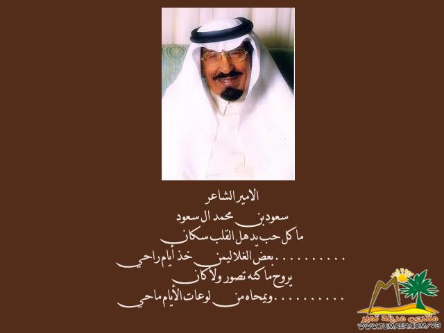 ،،،،،،،،،،،،،،،،،،، من عرفته وأنا أرجي كل يومٍ مجيّه أتسلـى بمزحـه وأتحمـل دلالـه ،،،،،،،،،،،،،،،،،،،،،،،، واتسوّق لهرجه لـو بـردّ التحيّـه منزله في السماء محدٍ بماله ينالـه ،،،،،،،،،،،،،،،،،،،،،، كود بالحظ وأسباب الغرام القويّـه الله اللي بكثر الملح طـوّر جمالـه ،،،،،،،،،،،،،،،،،،،،، مترفٍ شوفته تبري الجروح الخفيّه الامير سعود بن محمد |