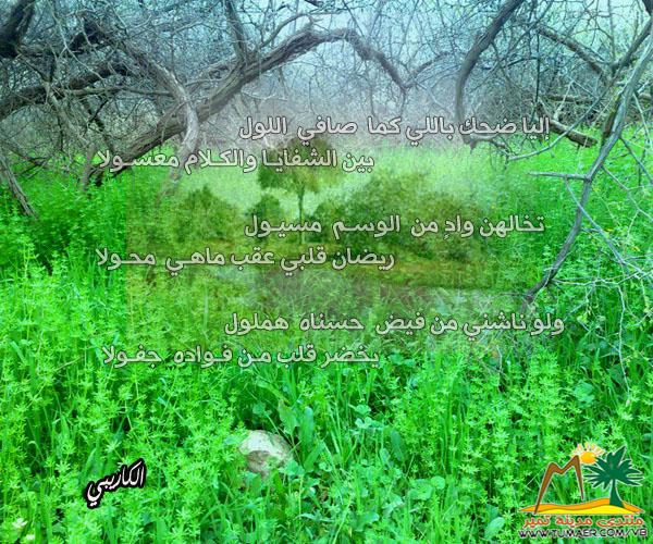 ![]() سقى الله «روضة التنهات».. روضة كاسب الطولات بسيلٍ في عروض العرق الأعلى بانت حدوده يسامرها رفيف البرق عشر أيام محسوبات ،،،،،،،،،،،،،،،،،،،،،،،،،،،تقول إن السحاب ليا تكاشف سل مجروده يعانق خدها وبل الحيا ويعوض اللي فات ،،،،،،،،،،،،،،،،،،،،،،،،،سكون الليل يصحا من رفيف البرق ورعوده يرتبها الربيع وتلبس الثوب الخضر بالذات ،،،،،،،،،،،،،،،،،،،،،،،،،،،،،،،،،ابد ماكنها إلاّ قطعة السجاد ممدوده يعاودها المطر لاهيب لا، مره، ولا مرات ،،،،،،،،،،،،،،،،،،،،،،،،،وتصبح مع مدى الأيام قصة عشق وانشوده تفلّ حجاجها للساعة اللي وابرك الساعات