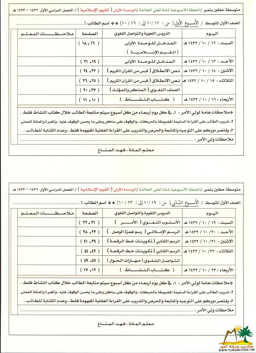 الخطـة الأسبوعية لمـادة لغتي الخالدة للصف الأول المتوسط للفصل الدراسي الأول ( 1432 ـ 1433 هـ ): الوحدة الأولى ( القيم الإسلامية ) الأسبوع الأول ( من : 12 / 10 إلى : 16 / 10 ) الأسبوع الثاني ( من : 19 / 10 إلى : 23 / 10 ) أتمنى أن تكون واضحة وميسرة نسعى دائماً لكل ما هو مفيد وشافي بإذن الله ؛ لأجل لغتنا الجميلة والخالدة لـغـــــــــة الـقــرآن الـكــريـــم أخوكم فهد المناع أبو بسام </U></I> |