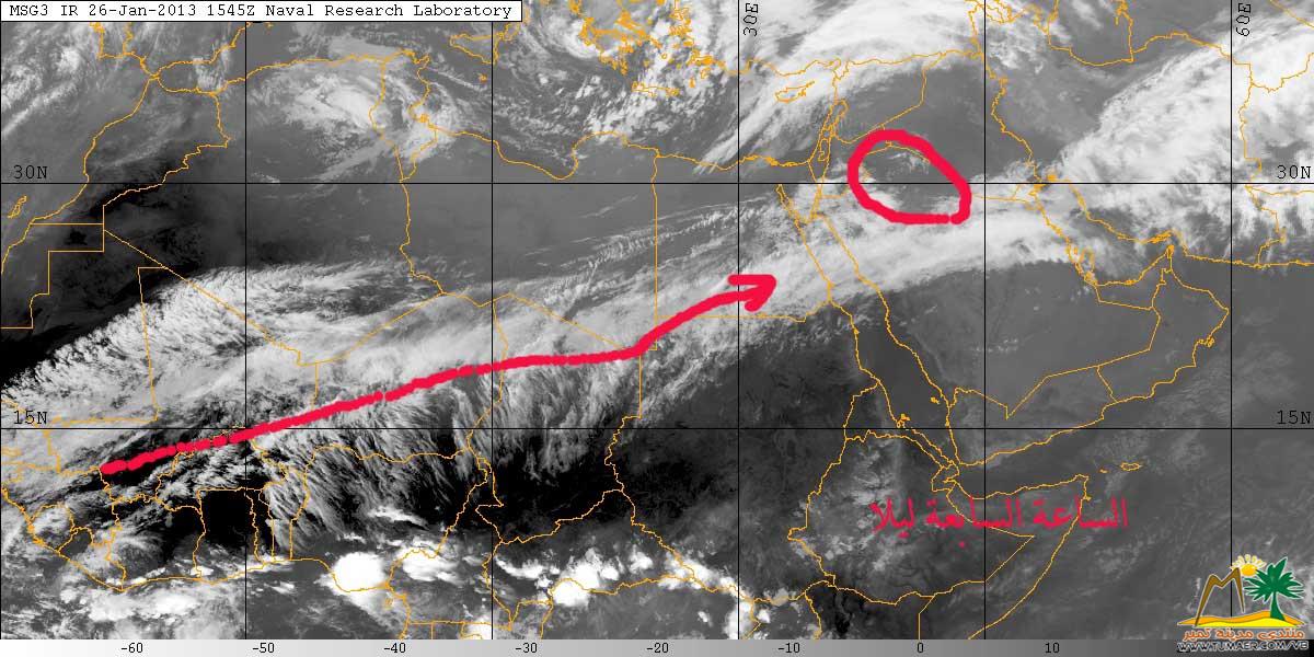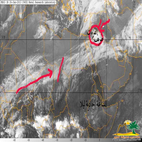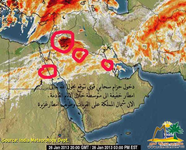 03-14-1434 10:54 AM عاجل - ( واس ) أكدت الرئاسة العامة للأرصاد وحماية البيئة وعبر بيان لها أن الفرصة مهيئة لتكون السحب الركامية الممطرة بإذن الله يصحب ذلك نشاط في الرياح السطحية تحد من مدى الرؤية الأفقية على مناطق حائل والجوف وتبوك وحتى الحدود الشمالية. تشمل الأجزاء الساحلية من شمال غرب المملكة. وتنشط الرياح السطحية مثيرة للأتربة والغبار تحد من مدى الرؤية الأفقية على أجزاء من مناطق مكة المكرمة والمدينة المنورة خاصة الداخلية منهما تشمل منطقة نجران وأجزاء من جنوب غرب المملكة. وسماء غائمة جزئيا على المرتفعات الجنوبية الغربية والغربية. |