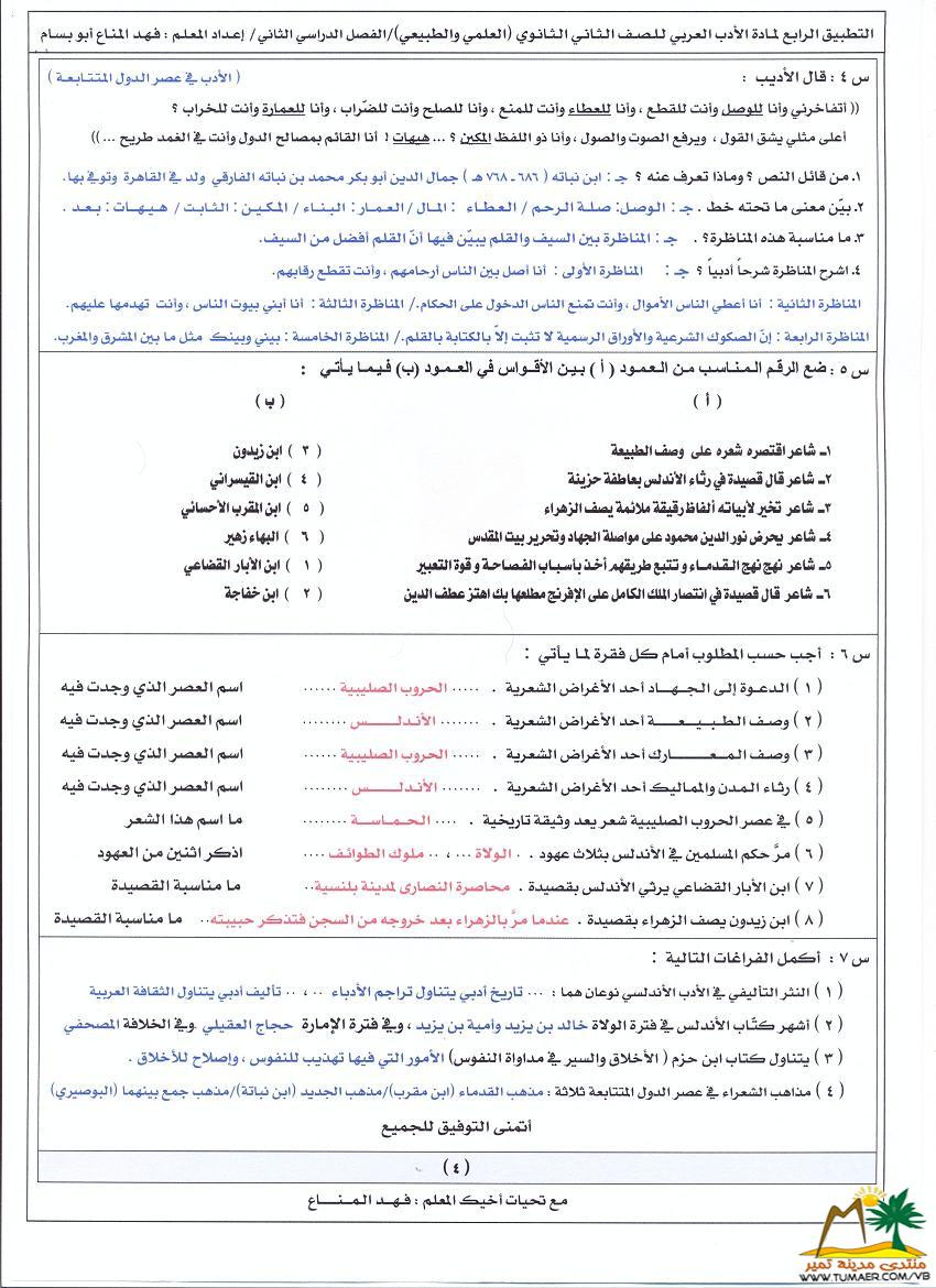 مادة الأدب العربي للصف الثاني الثانوي( بنين وبنات ) الفصل الدراسي الثاني ( التطبيق الرابع مع نموذج الإجابة ) : |