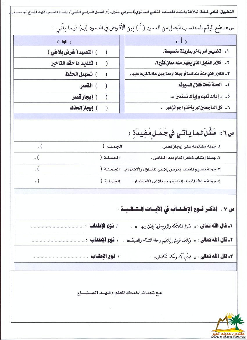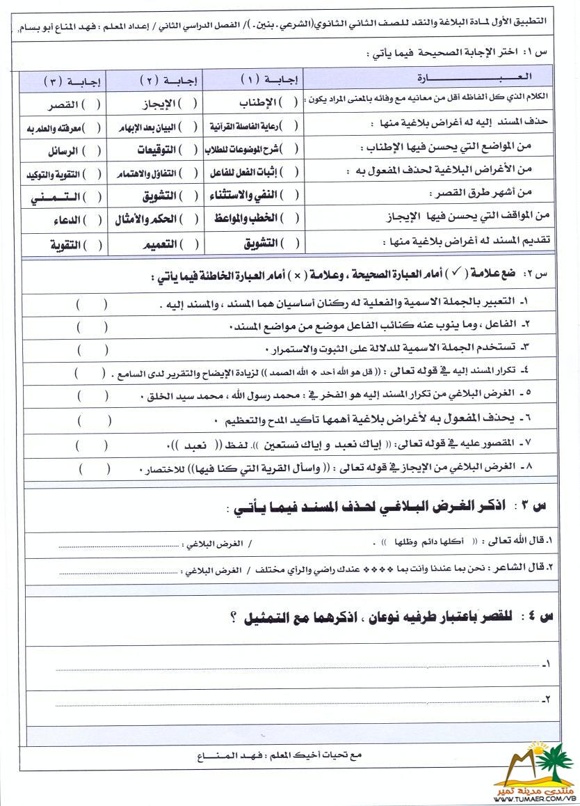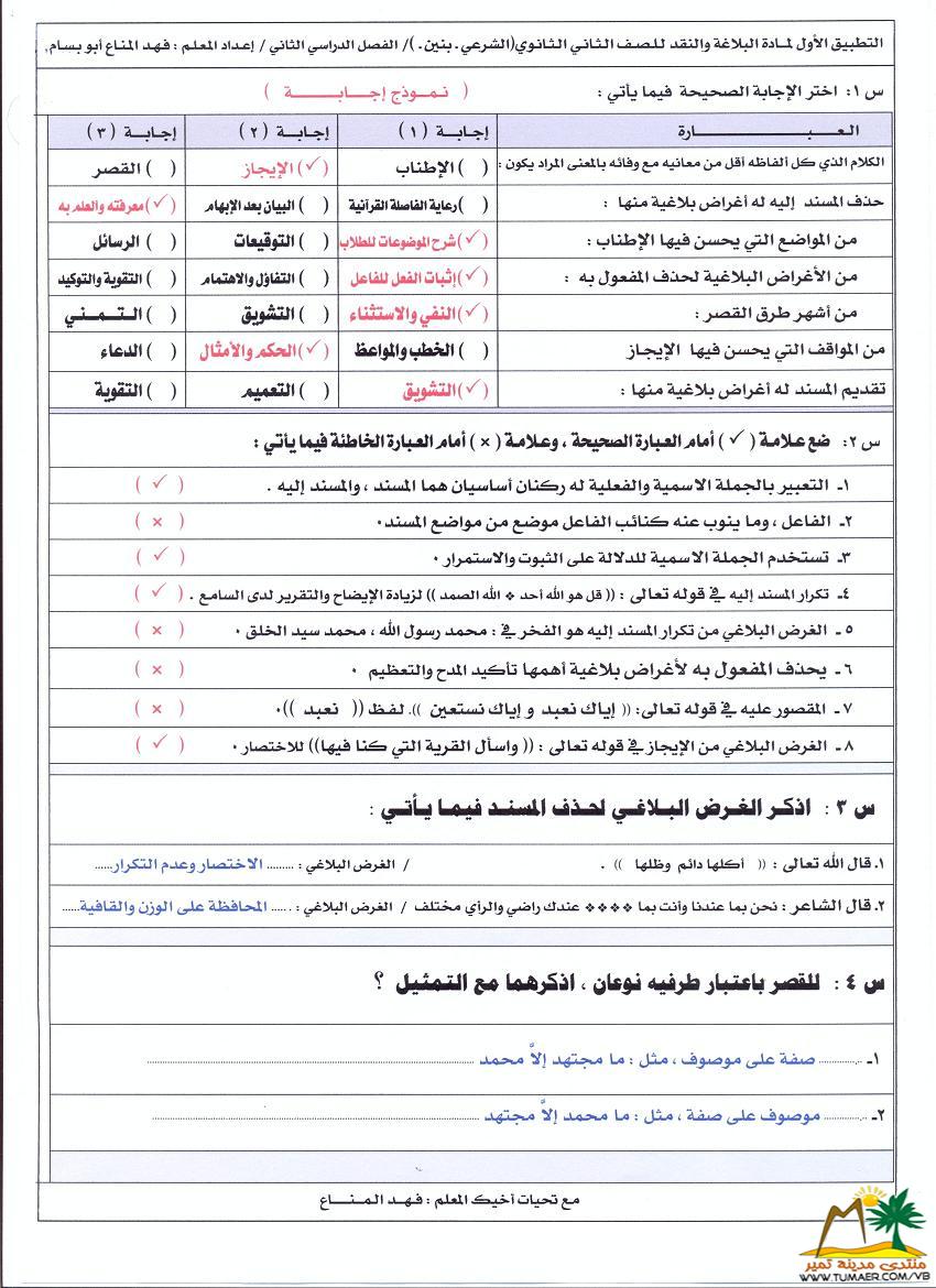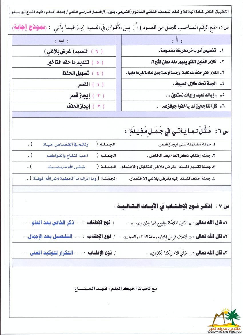 تطبيقات في مادة البلاغة والنقد للصف الثاني الثانوي( بنين ) الفصل الدراسي الثاني ( التطبيق الثاني مع نموذج الإجابة ) : |