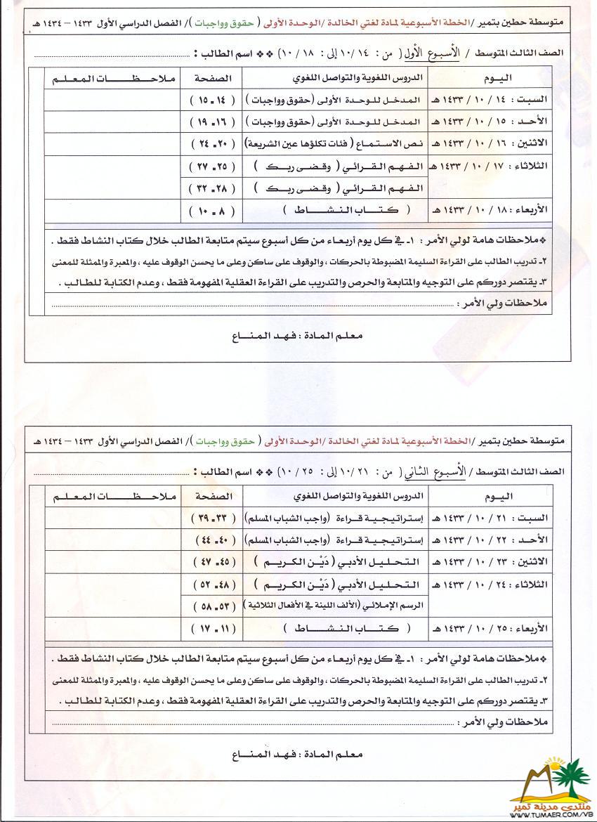 يطيب للمعلم فهد المناع بمدرسة حطين بتمير ويسره أن يقدم الخطة الأسبوعية لمادة لغتي الخـالـدة للصف الـثــالـث المتوسـط ( الـوحــدة الأولى ) للفصل الدراسي الأول ( 1433 ـ 1434 هـ ): |