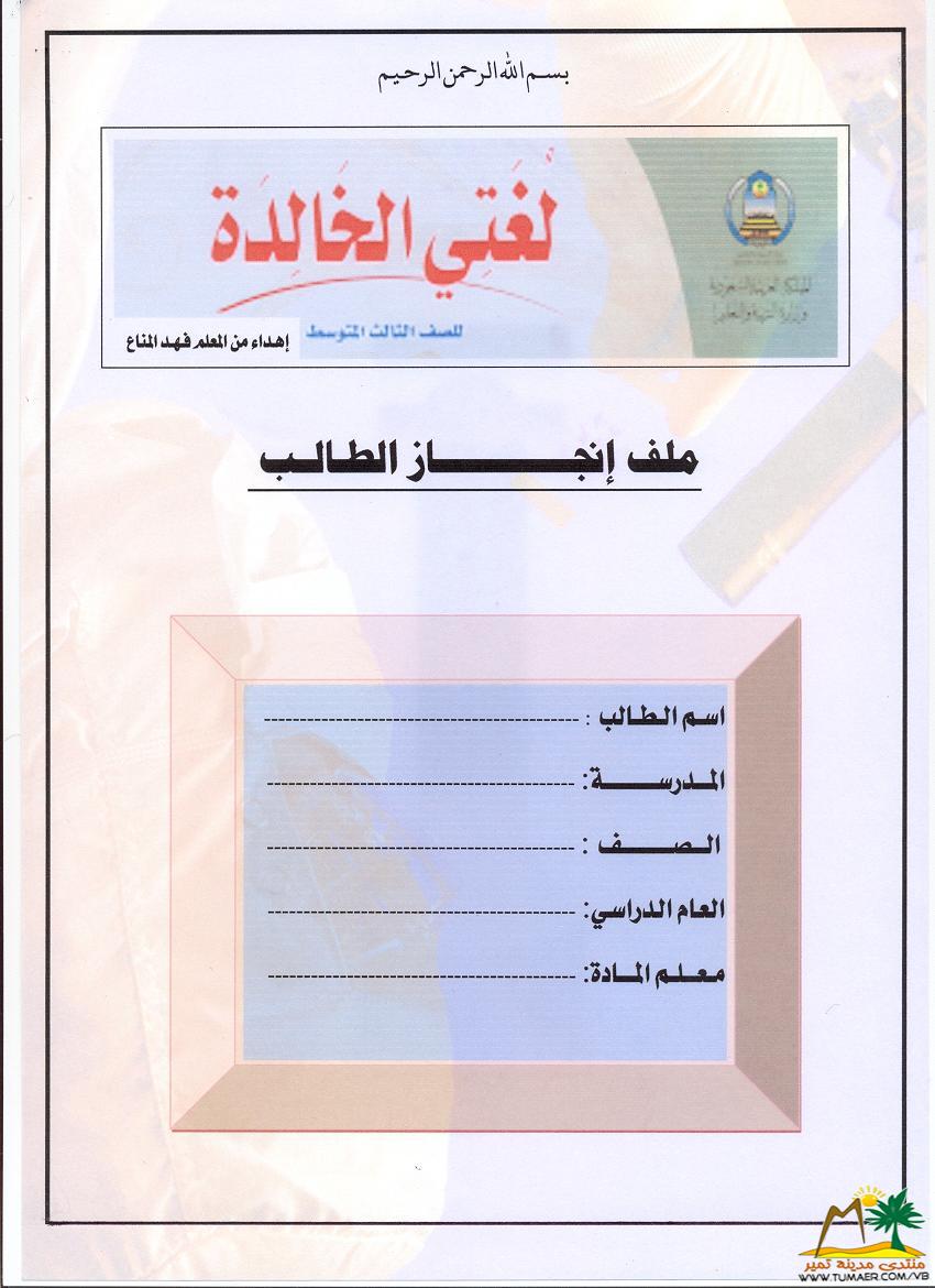 نموذج لغـلاف مـلـف أنجــــاز الـطــالـب لمـادة لغتي الجميلة للصفوف الرابع والخامس والسادس الابتدائي للفصل الدراسي الأول ( 1433 ـ 1434 هـ ): أتمنى أن تكون واضحة وميسرة نسعى دائماً لكل ما هو مفيد وشافي بإذن الله ؛ لأجل لغتنا الجميلة والخالدة لـغـــــــــة الـقــرآن الـكــريـــم أخوكم فهد المناع أبو بسام