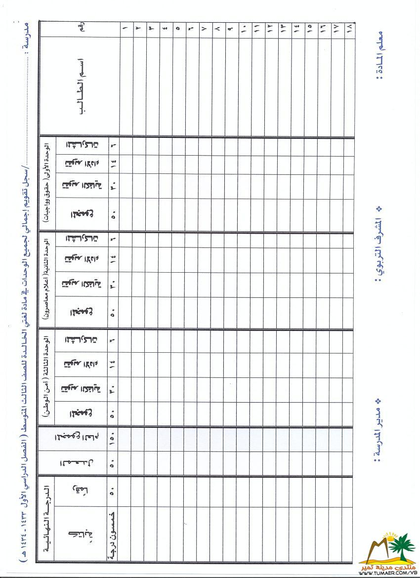 يطيب للمعلم فهد المناع بمدرسة حطين بتمير ويسره أن يقدم سجل تقويم إجمالي لجميع الوحدات لمـادة لغتي الخـالـدة للمرحلة المتوسطة للفصل الدراسي الأول ( 1433 ـ 1434 هـ ): |