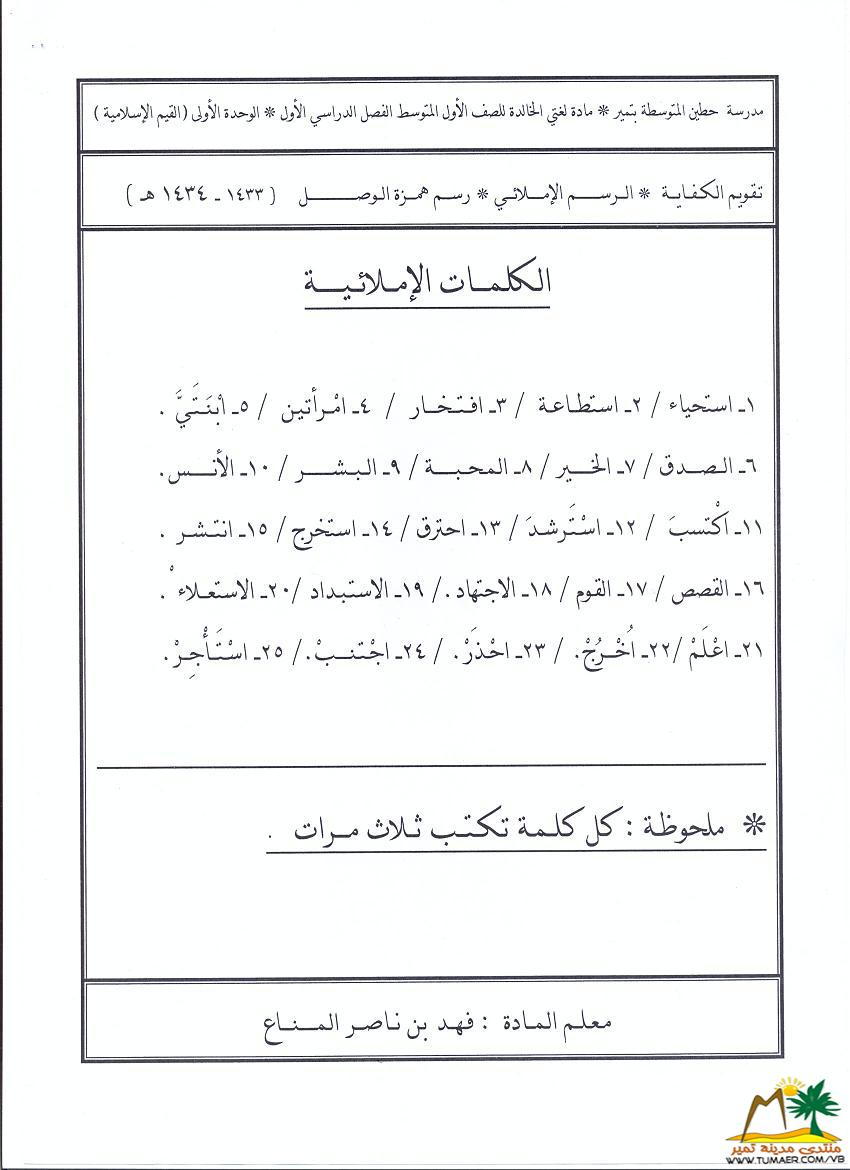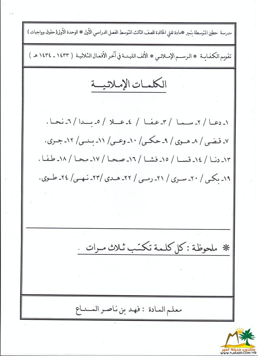 تقويم الكفاية للرسم الإملائي للوحدة الأولى لمـادة لغتي الخـالـدة للصف الثالث المتوسط للفصل الدراسي الأول ( 1433 ـ 1434 هـ ): |