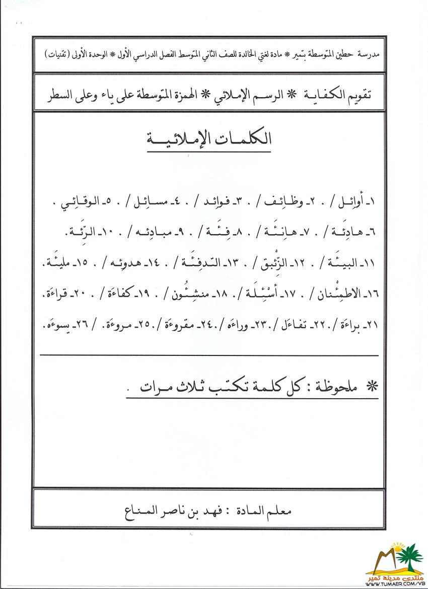 تقويم الكفاية للرسم الإملائي للوحدة الأولى لمـادة لغتي الخـالـدة للصف الثاني المتوسط للفصل الدراسي الأول ( 1433 ـ 1434 هـ ): |