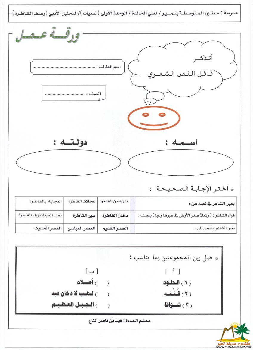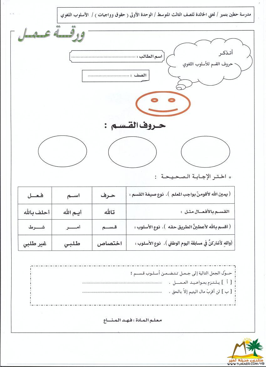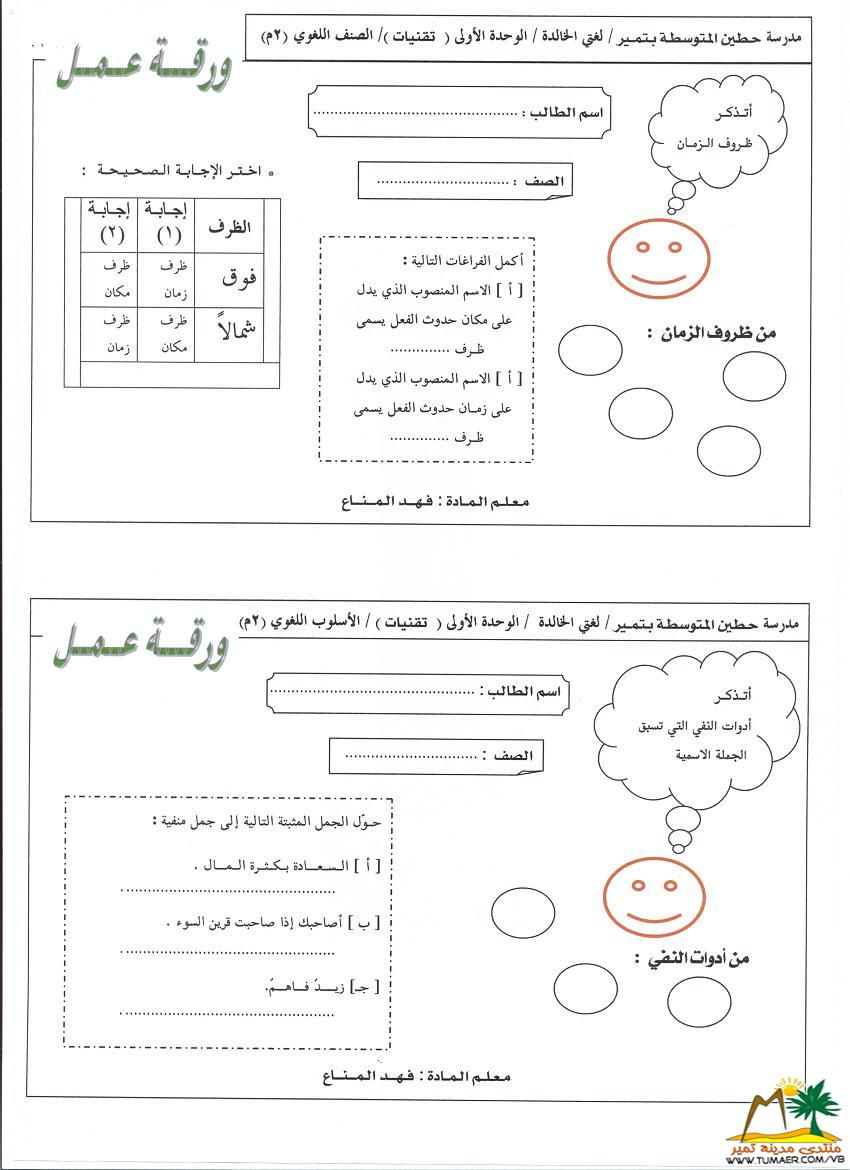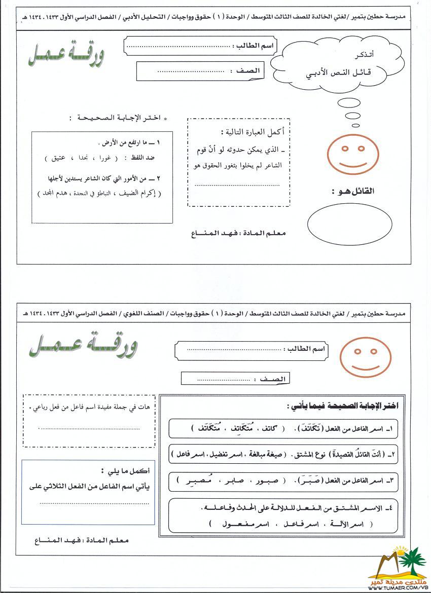 أوراق عمـل للوحدة الأولى لمـادة لغتي الخـالـدة للصف الـثـالـث المتوسط للفصل الدراسي الأول ( 1433 ـ 1434 هـ ): |