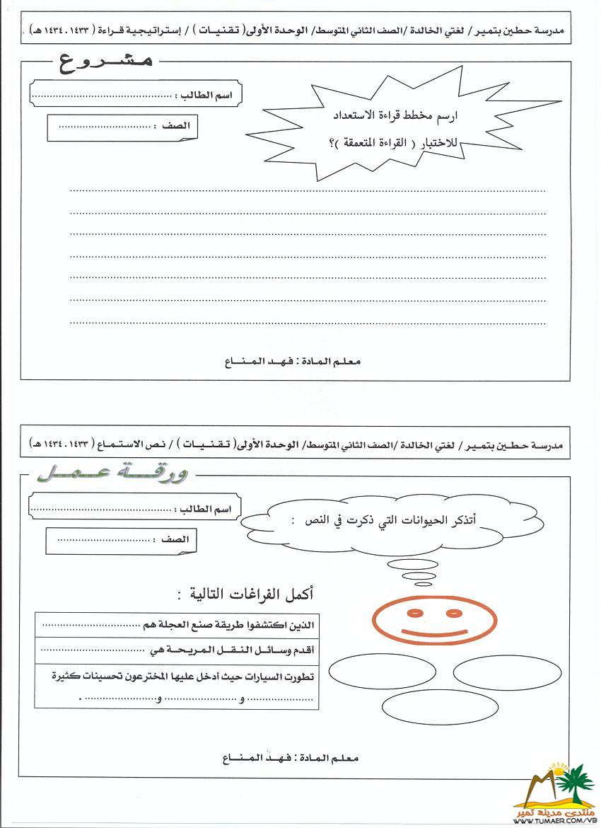 أوراق عمـل للوحدة الأولى لمـادة لغتي الخـالـدة للصف الـثـانـي المتوسط للفصل الدراسي الأول ( 1433 ـ 1434 هـ ): |