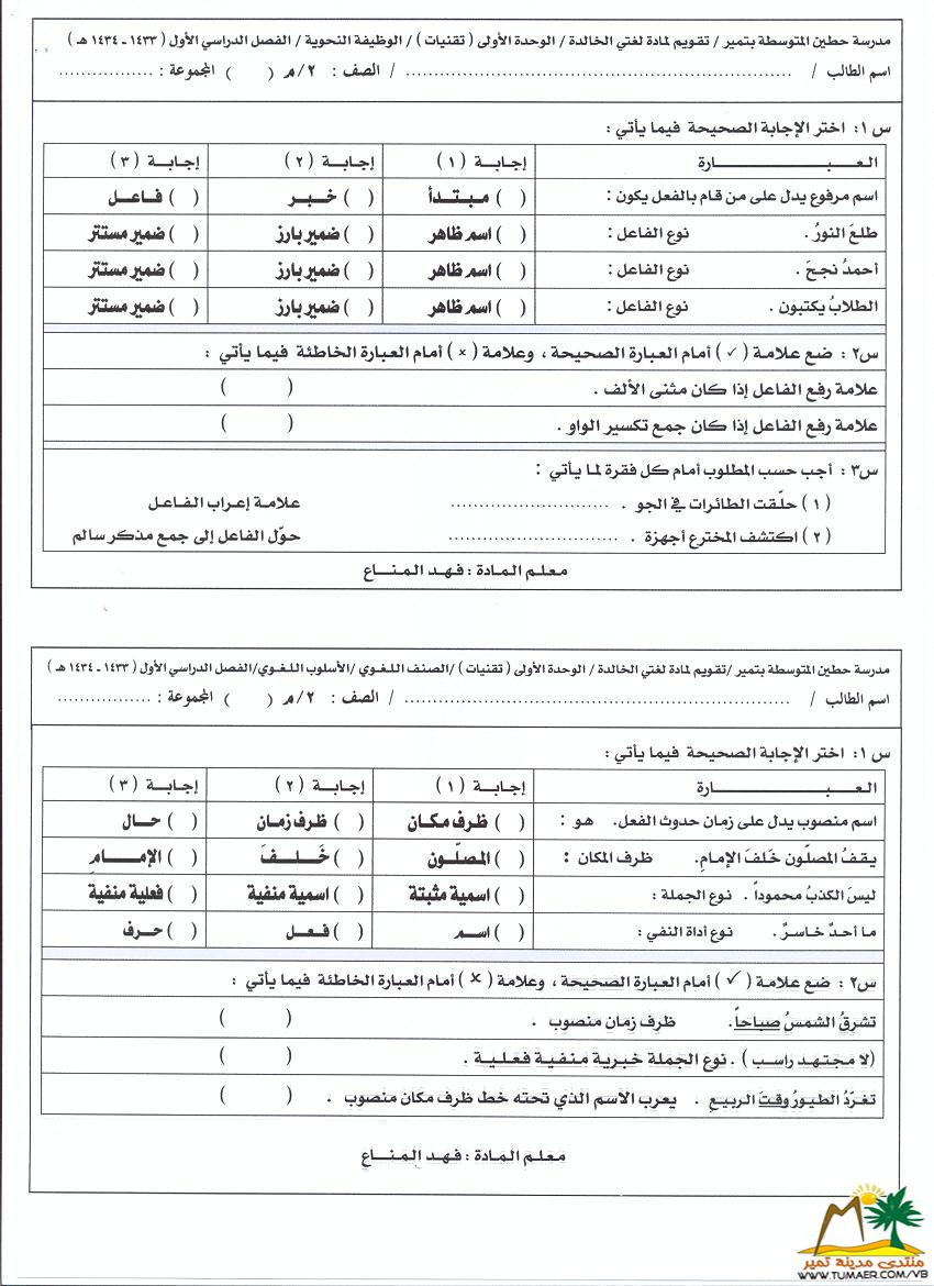 تقويم الكـفــايــة لـلــوحـــدة الأولى لمـادة لغتي الخـالـدة للصف الـثــانـي المتوسط للفصل الدراسي الأول ( 1433 ـ 1434 هـ ): |