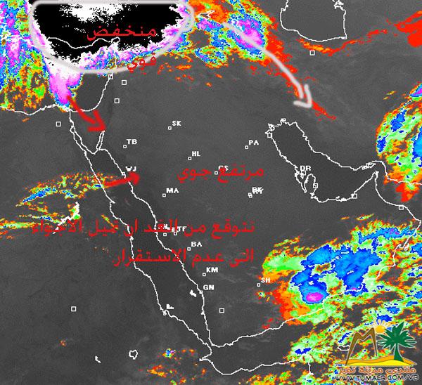الرياض- واس: توقّعت الرئاسة العامة للأرصاد وحماية البيئة في تقريرها عن حالة الطقس اليوم، استمرار نشاط الرياح السطحية المثيرة للأتربة والغبار التي تحدُّ من مدى الرؤية الأفقية على الأجزاء الجنوبية من شرق المملكة ووسطها؛ تمتد حتى الأجزاء الداخلية لغرب المملكة وتشمل منطقتَيْ نجران ومكة المكرّمة. كما توقّع التقرير تكوّن السُّحب الرعديّة المُمطرة على المرتفعات الجنوبية الغربية والغربية تشمل مرتفعات (جازان، وعسير، والباحة، والطائف)؛ تمتد حتى منطقة المدينة المنوّرة, ويطرأ ارتفاعٌ في درجات الحرارة على أجزاءٍ من غرب ووسط وشمال المملكة. |