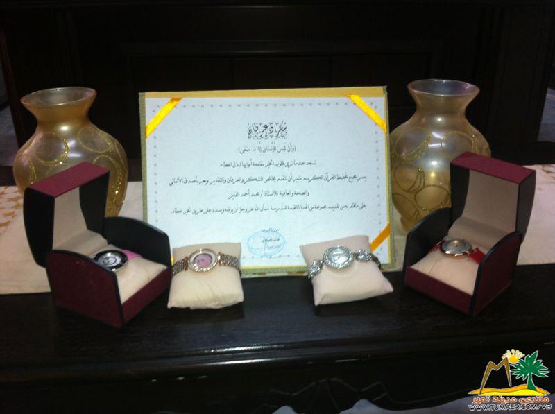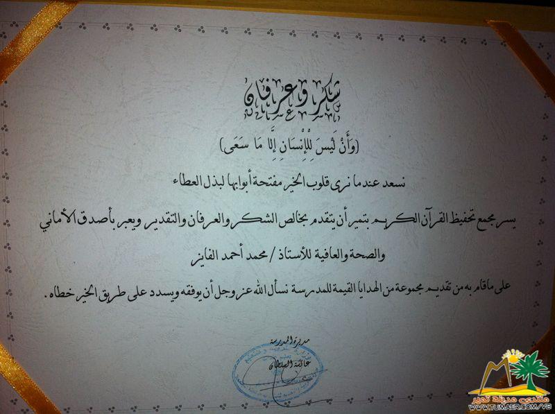 ولو أنني أوتيت كل بلاغة ****** وأفنيت بحر النطق في النظم والنثر لما كنت بعد القول إلا مقصرا ***** ومعترفا بالعجز عن واجب الشكر نسعد عندما نرى قلوب الخير مفتحة أبوابها لبذل العطاء يسر مجمع تحفيظ القرآن الكريم بتمير أن يتقدم بخالص الشكر والعرفان والتقدير ويعبر بأصدق الأماني والصحة والعافية للأستاذ / محمد أحمد الفايز على ماقام به من تقديم مجموعة من الهدايا القيمة للمدرسة نسأل الله عز وجل أن يوفقه ويسدد على طريق الخير خطاه سائلين المولى عز وجل أن يجعلنا وإياه من أهل القرآن .. وأن يرزقنا الفردوس الأعلى من الجنة .. وصدق الله إذ يقول : { هل جزاء الإحسان إلا الإحسان } |