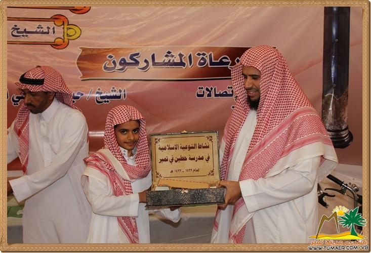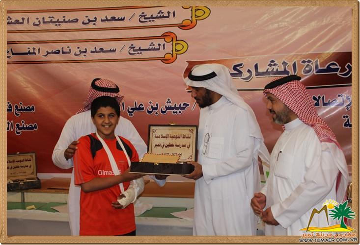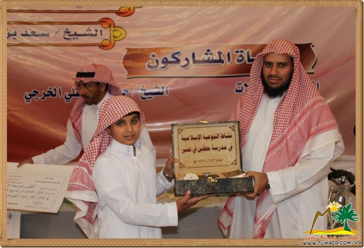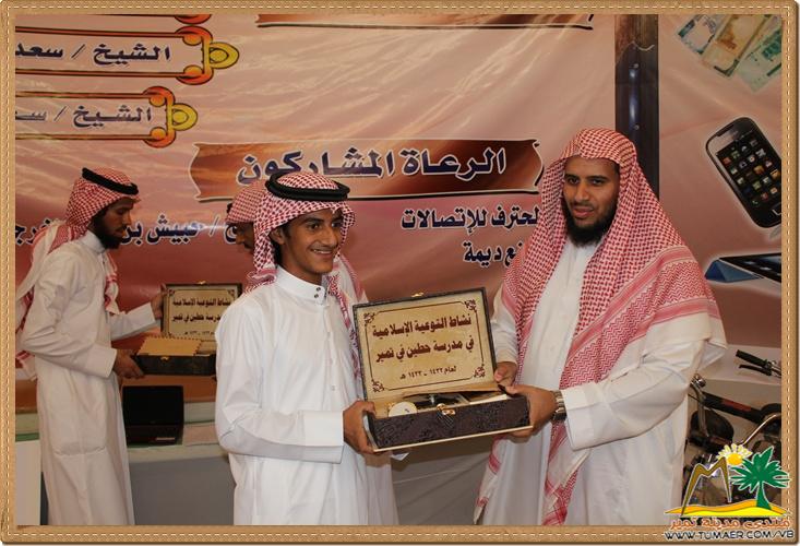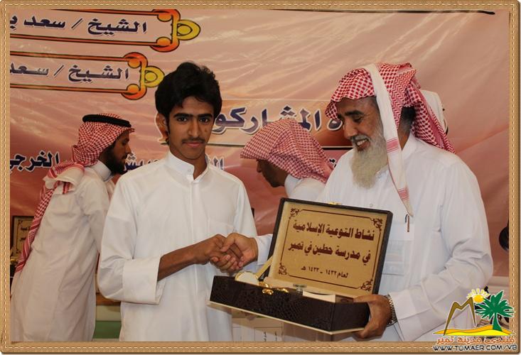 مدرسة حطين بتمير ابتهجت بحفل ختام أنشطة التوعية الإسلامية وذلك يوم الأحد الموافق : 29 / 6 / 1433 هـ تكريماً لطلابها المتميزين و الفائزين في مسابقة القرآن الكريم والسنة والسيرة النبوية وغيرها وكان ذلك على شرف حضور نائب مدير إدارة التربية والتعليم بمحافظة المجمعة الدكتور عبد العزيز العبدان ورئيس قسم التوعية الإسلامية الأستاذ عبد الملك بن عثمان بن الأمير ومدير مكتب التربية و التعليم بتمير ومديرو المدارس والدوائر الحكومية وأولياء الأمور، وكان الحفل تحت عناية مدير المدرسة الأستاذ غالب بن محمد الفيصل وبإشراف من رائد النشاط الأستاذ فهد بن ناصر المناع وبإعداد من رائد التوعية الأستاذ أحمد بن ناصر العبدالله ، والأستاذ عبدالعزيز بن سلطان الريس ، والأستاذ محمد بن عبدالله الفيصل . نترككم الآن مع التغطية المصورة لهذا الحفل : في الخــتــــام : نتقدم بوافر الشكر والتقدير للداعمين لهذا الحفل الـرعـــاة الـرئـيـــســيـــون الشيخ إبراهيم بن عبد المحسن السلطان الشيخ سعد بن صنيتان العشري الشيخ سعد بن ناصر المناع الـرعـــــاة المـشــاركـون الشيخ حبيش بن علي الخرجي المحترف للاتصالات مصنع ديمة مصنع فش فاش مصنع العطير |