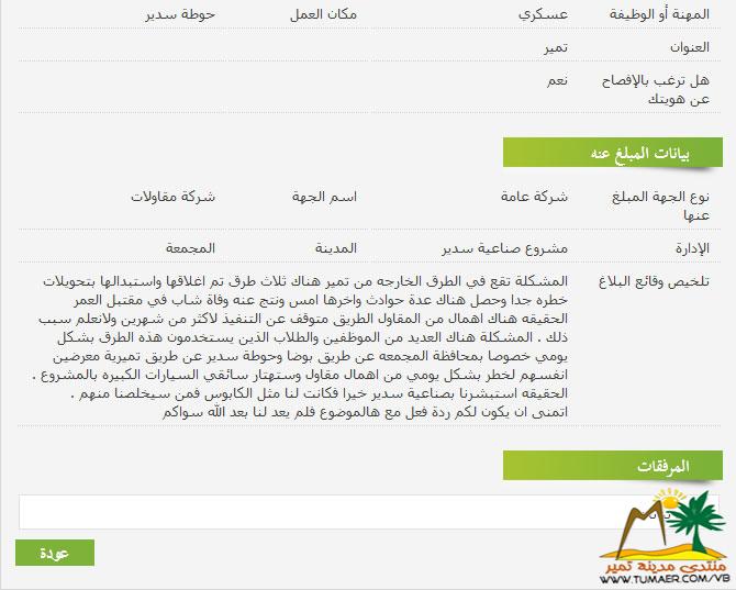 العنوان واضح تعبنا من اهمال المقاولين المستلمين لمشاريع الطرق خصوصا طريق بوضا والي يستخدمة الموظفين والطلاب والطالبات بالمجمعه كذلك طريق تمريه وعشيرة لموظفي وطلاب حوطة سدير . هناك اهمال غير طبيعي مدري وش سببه . ومن يدفع ثمن هالاهمال نحن اهالي تمير والقرى القريبه منا امس فقدنا الشاب أحمد ابراهيم المناع رحمه الله وغدا من يكون ياترى !!!! وقد حصل العديد من الحوادث الشنيعه بطريق عشيرة الى مته ومن المسئول عن التاخر وهل ارواحنا رخيصه الى هذا الحد يجب ان يكون هناك وقفه صادقه من كبار تمير والتواصل مع المسئولين لحل هذه المشكله باسرع وقت الطريق الي بتمريه تقريبا جاهز وبشكل كبير ولم يبقى الا الاسفلت ولان له اكثر من شهرين وهو متوقف . وش الحل من المسئول عن هالاهمال ومن الي يقدر يحاسبهم |