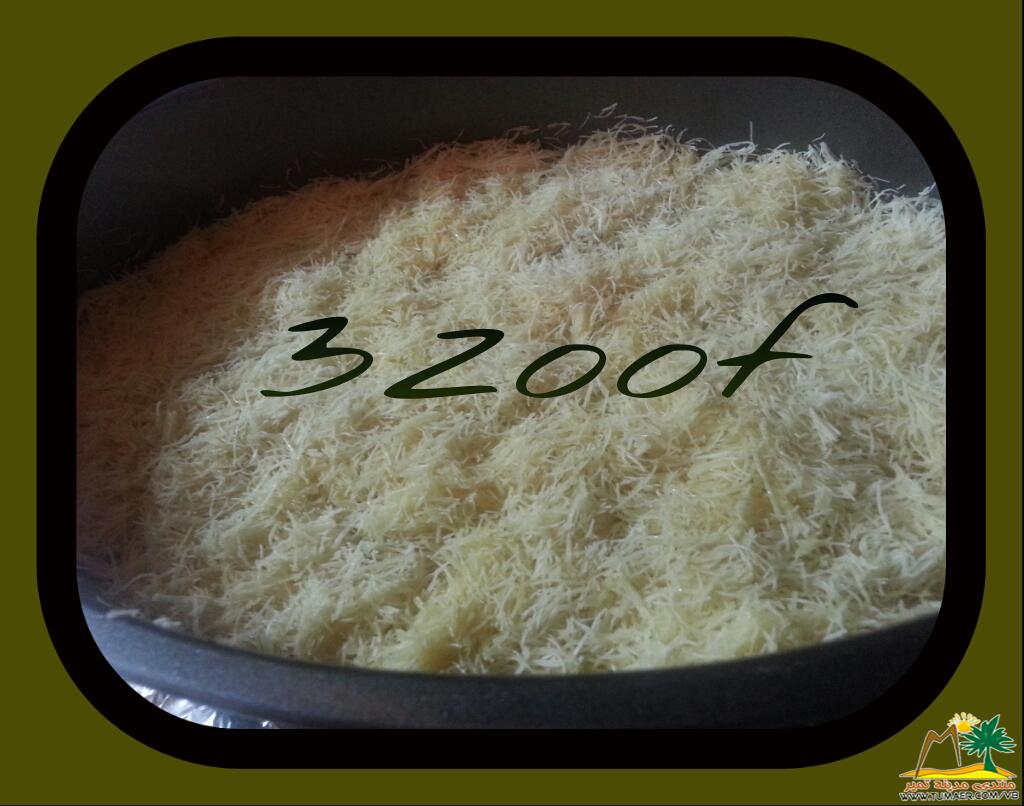الطريقة|| نقلب الكنافة بالزبدة هكذا.. بعد ذلك نضع القشطة والجالكسي ونغطيها مرة ثانية بالكنافة ونحمرها بالفرن من تحت وفوق ونصب الشيرة عليها وبالعافية |