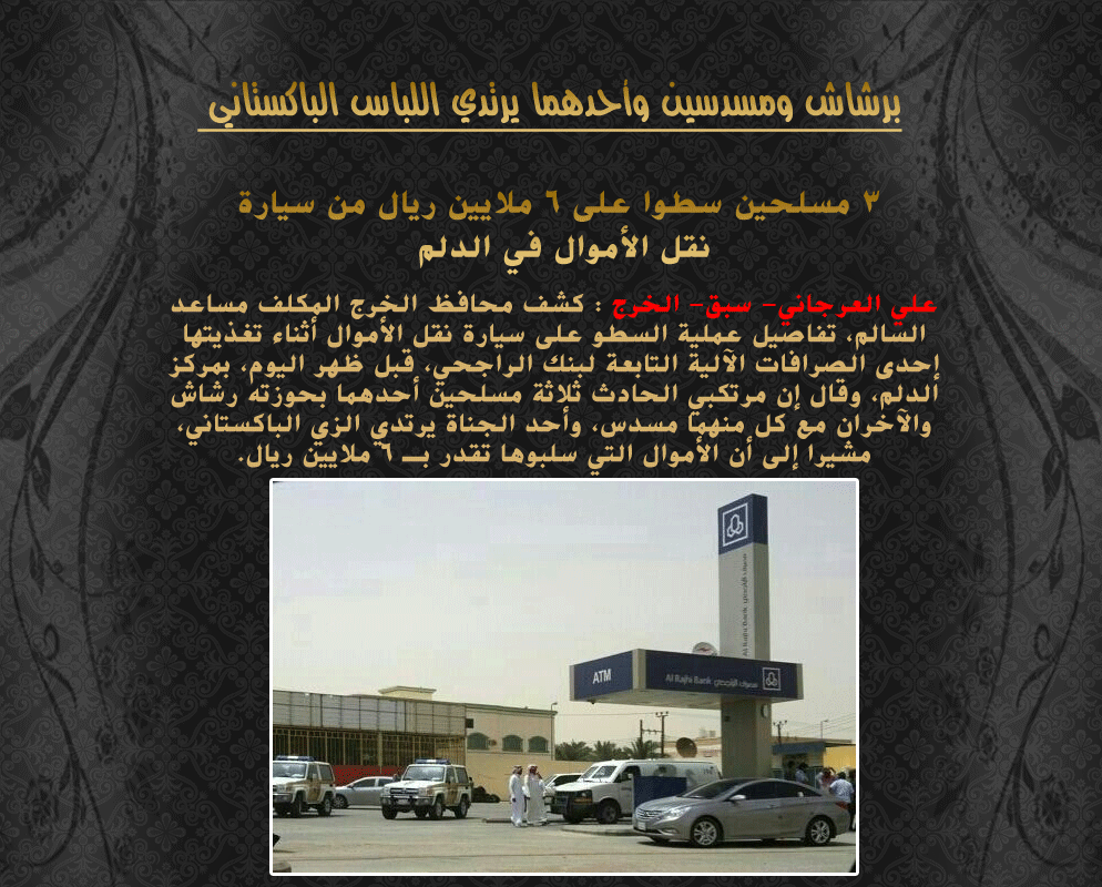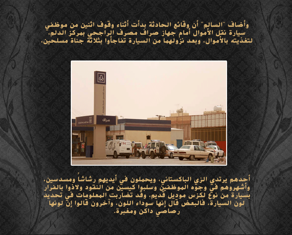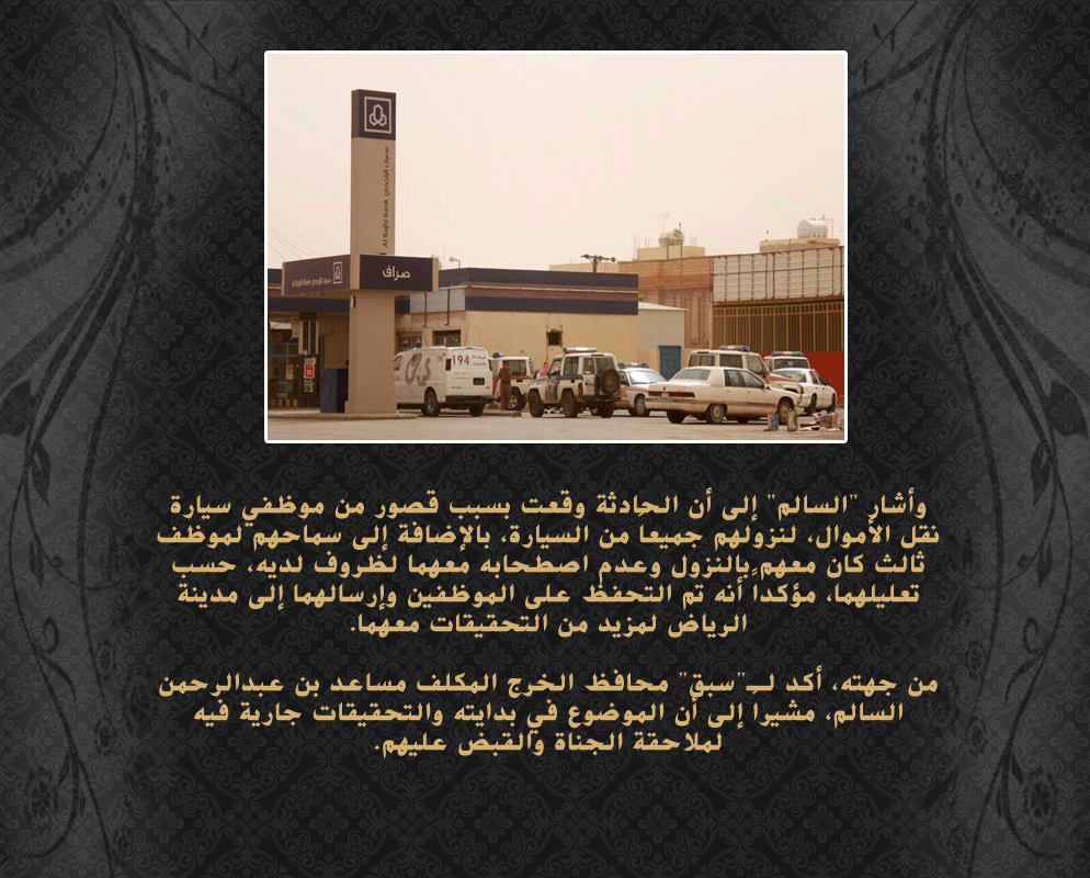 سرقة عيني عينك وفي وضح النهار مسلحين .. الله يكشفهم .. ومدري عن هاللي صرفوا ثالثهم .. وبعدين هل الأموال يحطونها في خياش أو في صناديق حديد .. خبر مخيف .. بالمصمم .. وفالك الفوز .. |