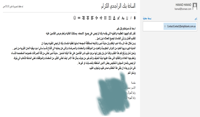 تم مخاطبة البنك برسالة بريد وهذا نص الرساله
