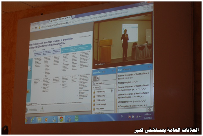 العلاقات العامة بمستشفى تمير أقام مستشفى الملك فهد بجدة ورشة عمل لبيان " آلية العمل لفرق الطوارئ الإقليمية المشكلة للتعامل مع متلازمة الشرق الأوسط التنفسية ( كورونا ) " حيث تم بث فعاليات ورشة العمل إلى جميع مديريات الشؤون الصحية والمدن والمجمعات الطبية والمستشفيات من خلال البث الحي المباشر عبر شبكة الوزارة للاجتماعات المرئية ( video confernce ) .