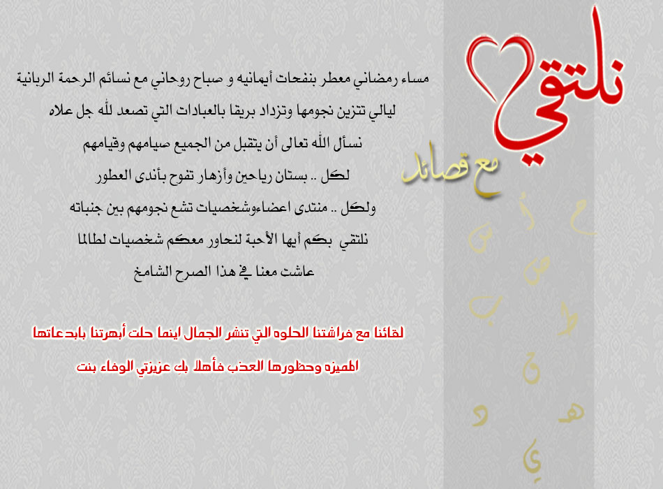 السلام عليكم ، ومساء الخير للجميع مبارك عليكم العشر ، وجعلنا وأياكم من المجتهدين فيها ، والله يجعلنا ممن تدركهم الرحمة ثم ، المغفـرة ، ثم العتـق من النـأر . في البداية آشكرك آختي الغالية : قصائد على جهودكِ الطيبه والمتميّزه ، كما آشكرك على آستضافتي في موضوعكِ الرائع ، لا اجد لنفسي عذرآ في عدم الحضور ، وتقديم شكري وآمتناني لك ِ ، آتمنّى لي وللجميع القبول في هذا الشهر الكريم ، |