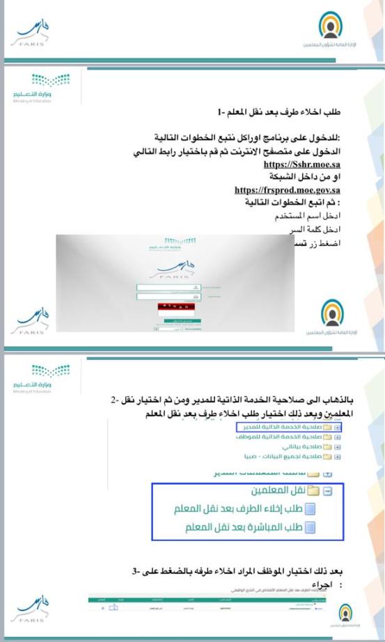 سواء الداخلي أم الخارجي «التعليم» تنبه المشمولين بحركة النقل وتنشر طريقة الإخلاء ![]() الطائف -الوئام -عبدالله العازمي : كشف المتحدث لوزارة التعليم مبارك العصيمي عن بدء عملية ترحيل بيانات المعلمين والمعلمات الذي شملتهم حركة النقل الخارجي والداخلي إلى نظام ”فارس”. وأضاف العصيمي أن ذلك يأتي تمهديدًا لاستكمال تنفيذ إخلاءات الطرف آليا من الرئيس المباشر بدون الحاجة إلى مراجعة المدرسة ،باستثناء من لديهم عهد فعليهم متابعة تسليمها حسب النظام ليتم استكمال إخلاء طرفهم. وأشار إلى أنه على المعلمين والمعلمات المباشرة في مدارسهم الجديدة حسب التاريخ المحدد للعودة في التقويم الدراسي. ![]() ![]() ![]() |