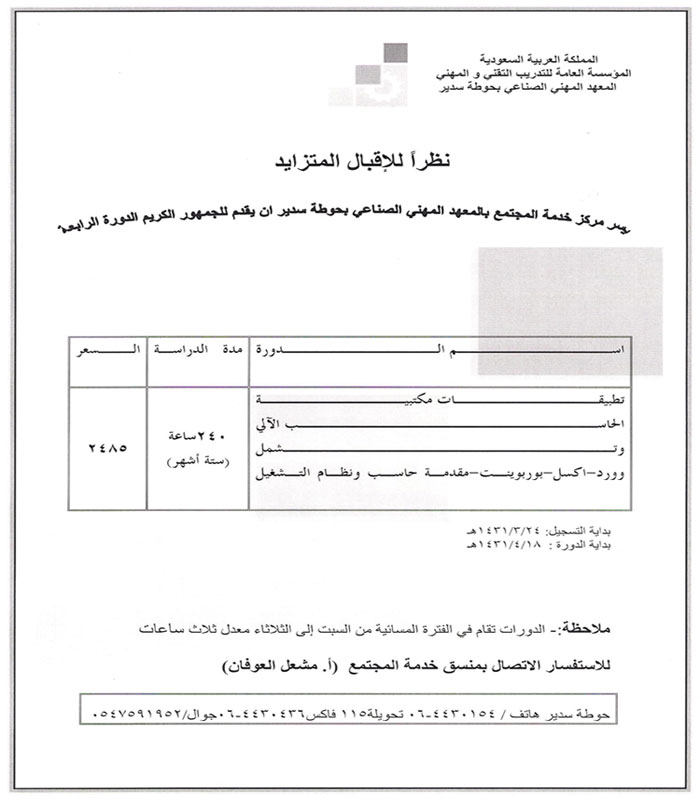 صدرت موافقة معالي محافظ المؤسسة العامة للتدريب التقني د. علي بن ناصر الغفيص على محضر تجهيز وتشغيل الوحدات التدريبية والمتضمن الموافقة على افتتاح برامج المستوى الثالث(الدبلوم) لقسمي الكهرباء والسيارات اعتبارا من بداية العام التدريبي القادم 1431-1432هـ. ذكر ذلك مدير المعهد المهني الصناعي بحوطة سدير /عادل بن إبراهيم العريج ، الذي أشار إلى أن مدة التدريب سنتان وسبعة أشهر تحتوي ثمانية فصول تدريبية يحصل خلالها المتدرب على شهادة الدبلوم التي تتيح له أمكانية مواصلة الدراسة بالكلية التقنية في ذات التخصص علماً أن شهادة الالتحاق بتلك البرامج هي الكفاءة (المتوسطة). وشكر مدير المعهد في النهاية معالي المحافظ د. على الغفيص وسعادة نائب المحافظ للتدريب د. حمد العقلا ورئيس مجلس التدريب التقني والمهني بالرياض د. أحمد الحامد على جهودهما ودعمهم للبرامج التدريبية بالمعاهد المهنية الصناعية. دورة تطبيقات مكتبيه الحاسب الالي ![]() |