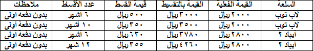 بسم الله الرحمن الرحيم السلام عليكم ورحمة وبركاته:- يسرني أن أعرض عليكم أجهزة كمبيوترات محمولة وأجهزة أيباد2 بمواصفات عالية بالتقسيط بشروط وأقساط ميسرة وفي متناول الجميع للموظفين السعوديين والأجانب وأيضا لغير الموظفين بدون دفعة أولى وبدون كفيل للموظفين والنسب والشروط كما هي موضحة في الأدنى ,,, جدول يوضح السلعة وقيمتها الفعلية في السوق وقيمتها الفعلية بعد التقسيط وعدد الأقساط الشهرية وللعميل الاختيار بما يناسبه من قسط شهري علماً أن بداية القسط الأول تبدءا بعد 30 يوماً من توقيع العقد ولا يلتزم العميل بدفع أي مبلغ كدفعة أولى .. :: الشروط للموظفين :: 1- شيكات بقيمة كل قسط . 2- صورة بطاقة الأحوال المدنية . 3- تعبة استمارة العقد المتفق علية . :: الشروط للموظفات :: 1- شيكات بقيمة كل قسط . 2- كفيل غارم موظف ( رجل ) . 3- صورة بطاقة الأحوال المدنية للكفيل . 4- تعبئة استمارة العقد المتفق علية . :: الشروط لغير الموظفين والغير موظفات :: 1- شيكات بقيمة كل قسط . 2- كفيل غارم موظف ( رجل ) . 3- صورة بطاقة الأحوال المدنية للكفيل . 4- تعبئة استمارة العقد المتفق علية . :: الشروط للأجانب الغير سعوديين :: 1- كفيل غارم موظف سعودي ( رجل ) . 2- شيكات بقيمة كل قسط للكفيل . 3- صورة بطاقة الأحوال المدنية للكفيل . 4- صورة إقامة المشتري . 5- تعبئة استمارة العقد المتفق علية . في حال وفاة العميل لا قدر الله يسقط عنه كامل المبلغ المتبقي من العقد , وللمزيد من الأستفسارات يرجى أرسال رسالة على الخاص وسيتم توضيح جميع الأستفسارات الخاصة بكم..