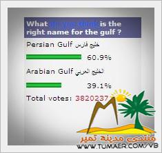 آعترضت إيرآن على شركة قوقل لـتسميتهآ آلخليج آلعربي بهذآ الإسم وتطآلب بأن يسمى آلخليج آلفآرسي وطبعاً لآنهآ مو أي دولة .. شركة قوقل آستجآبت لطلبهآ وسوت تصويت على الإسمين ... وقآلت إلي تكون له آلنسبة الأكبر رآح نحطه وآحنآ آلعرب نآيمين وآلصدمة إن نسبة آلتصويت إلى الآن أكثر من 71% < لإسم آلخليج آلفآرسي ..!!! وبالنسبه للطريقة .. افتح الصفحه وروح يمين شوي تلقى مربع ازرق صغير .. اضغط على الخليج العربي وبعدها اضغط على vote بالتوفيق هذآ رآبط آلتصويت http://www.persianorarabiangulf.com/index.php صوت ولآ تنسى تنشرهـ بآلبريد قد مآ تقدر خلوهم يدرون أننا أكثر منهم ... والله تراه صدق أنا فتحت ولقيته صدق وضاق صدري افتحوه وتأكدوا :'( ^والحين %39 لنا و61% لهم