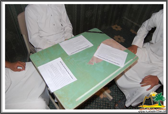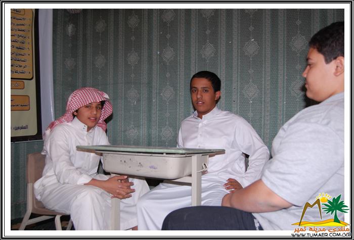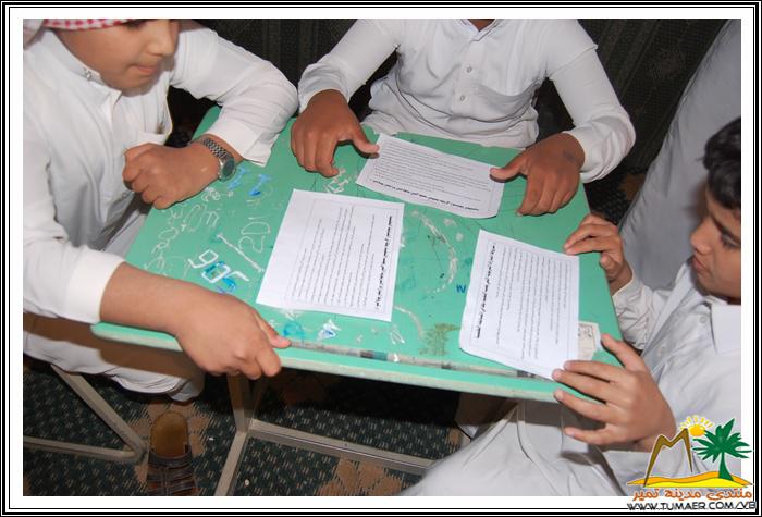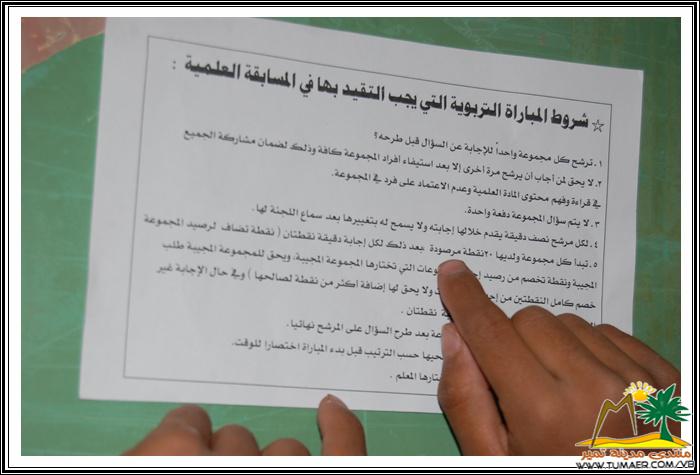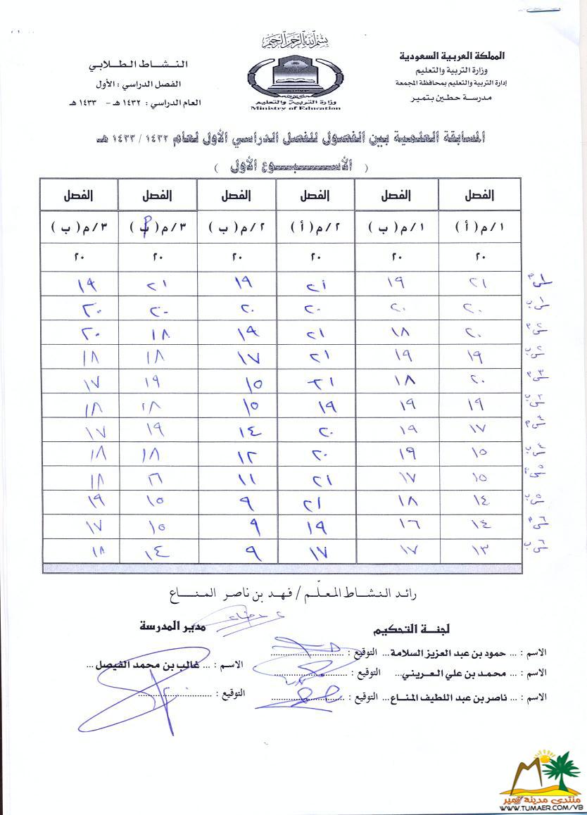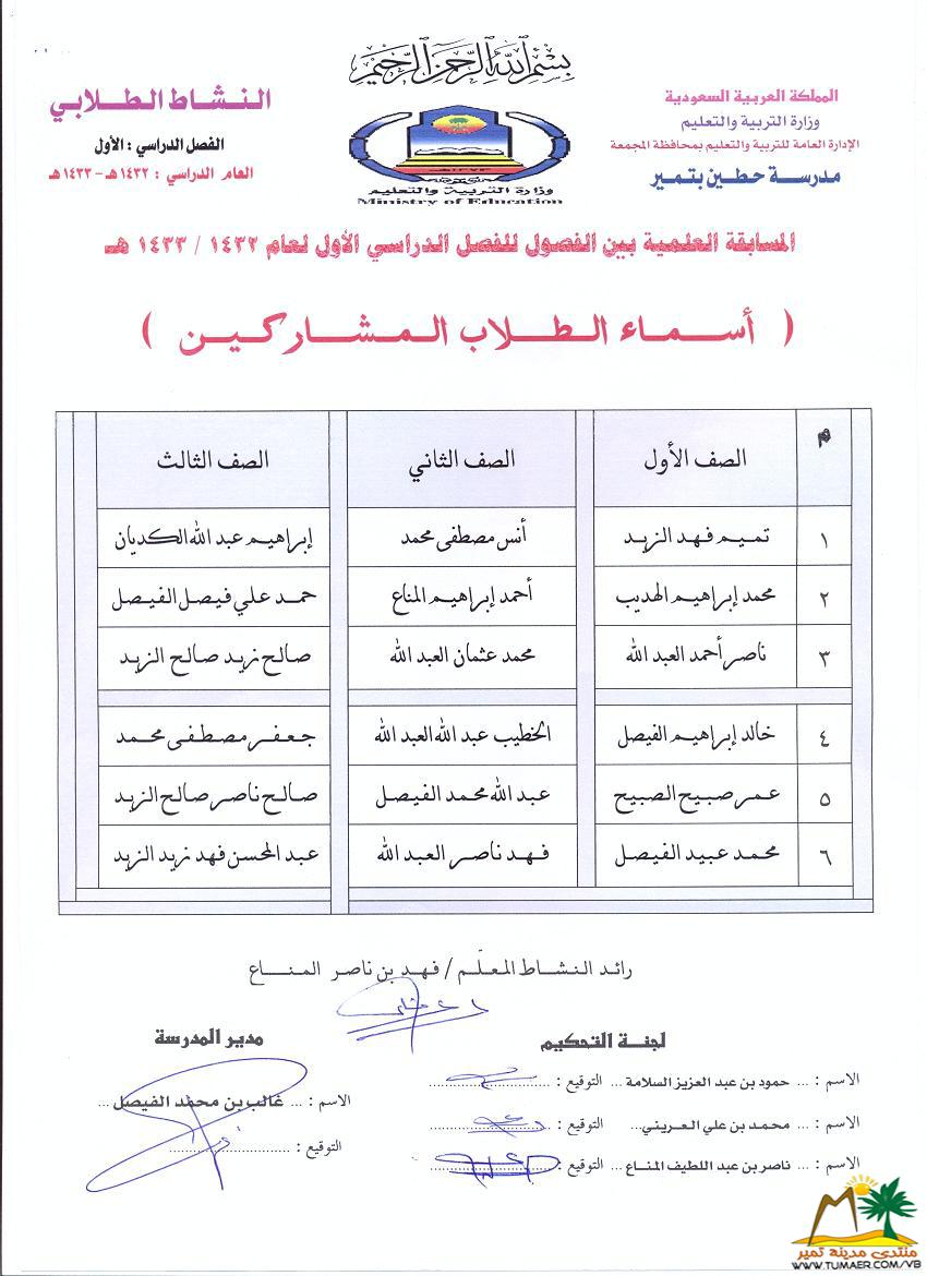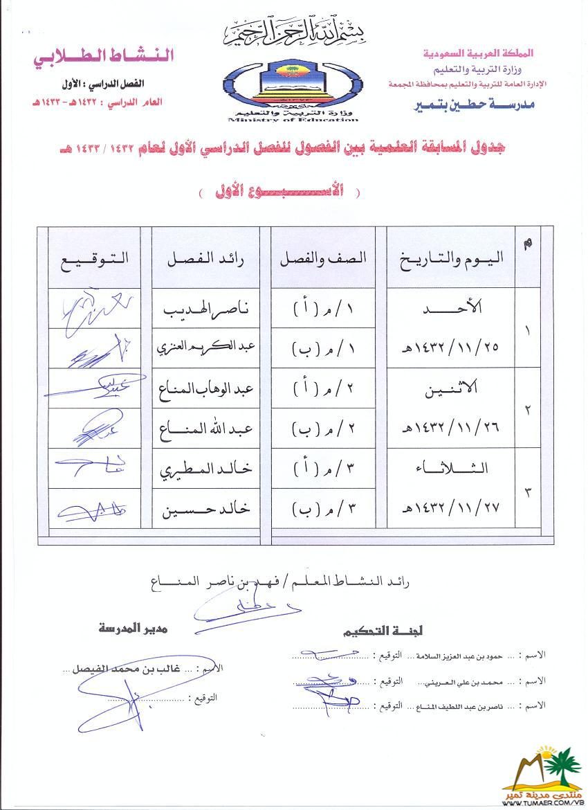 أقامت مدرسة حطين بتمير مسابقة علمية بين الفصول للفصل الدراسي الأول لهذا العام 1432/ 1433 هـ بطريقة وأسلوب المباراة التربوية ، قدمها رائد النشاط الأستاذ القدير فهد بن ناصر المناع على جولات بتجميع النقاط حسب الشروط المقيدة لذلك ، وكانت المباراة التربوية قد وضع لها جدول بالأسابيع ، تقام في الأيام الثلاثة : الأحد والاثنين والثلاثاء من كل أسبوع ، وفي المباراة النهائية سيكرم الفصل الفائز بالبطولة بجوائز قيمة ومناسبة وممتعة تليق بالمسابقة ، ويشرف على المسابقة لجنة تحكيم نخبة من المعلمين الفضلاء يترأسهم الأستاذ القدير : ناصر بن عبداللطيف المناع حمود بن عبد العزيز السلامة محمد بن علي العريني . وهذه نماذج لآلية المسابقة ، بداية بأسماء الطلاب المشاركين في المسابقة ، وجدول أسبوعي للمسابقة ، ونتيجة لتقييم المسابقة العلمية ، وشروط للمباراة التربوية التي يجب التقيد بها في المسابقة العلمية . |
