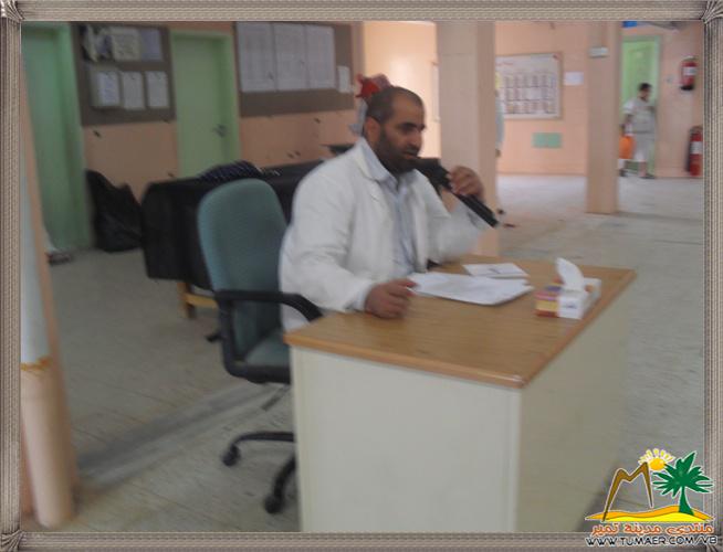 برعاية إدارة المركز الصحي بمدينة تمير وجهت الطبيب أيمن بن عبدالغفار القزاز إلى مدرسة حطين بتمير صباح يوم الثلاثاء الموافق : 19 / 12 / 1432 هـ لإلقاء محاضرة عن مرض السكري أمام طلاب المدرسة بالتنسيق مع رائد النشاط الأستاذالقدير فهد بن ناصر المناع ، حيث قام بدوره كرائد للنشاط بوضع آلية وتنظيم للبرنامج فوجدنا تجاوب الطلاب مع الطبيب بالاستماع والانصات ، وطرح الأسئلة لإجابة الطبيب عنها. نترككم الآن مع تغطية ومتابعـة الـبرنـامـج : في الختام : قدمت إدارة المدرسة شكرها وتقديرها للطبيب أيمن على تجاوبه وتوضيحه الكامل لكل ما يتعلق بالمرض من أسباب ومسببات وعلاج متمنية للطبيب ولإدارة المركز الصحي التوفيق والسداد . |