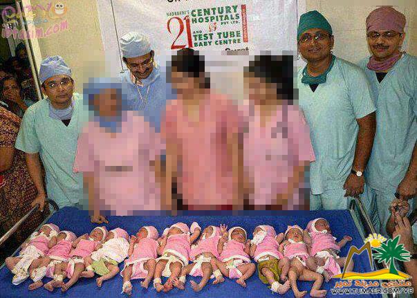 المواليد مع طاقم المستشفى . وضعت سيدة هندية 11 مولودا في حالة تعد الأغرب من نوعها على مستوى العالم ، الأمر الذي لم يثر انبهار مجموعة الأطباء وطاقم التمريض ،في المستشفى الذين قاموا بتوليدها فحسب ، بل أثار انبهار العالم أجمع. وتداولت صورة الأم مع أطفالها الـ 11 عبر شبكة الانترنت تحت عنوان " امرأة هندية تلد منتخبا وطنيا مكونا من 11 لاعبا" بشكل واسع النطاق، وسط عشرات التعليقات التي تردد وتقول: "سبحان الله". وقالت مصادر هندية : أن الام المذكورة من اسرة فقيرة الحال وقد توجهت الى احد المستشفيات العامة الحكومية في الهند للولادة وزوجها هو عامل في احد متاجر البخور . واضافت تلك المصادر : اندهش فريق الاطباء بسبب كبر حجم بطن الام الحامل بما لايتناسب مع طولها وحجم جسمها ، وان ولادة هذا العدد من الاطفال أثار الدهشة على المشرفين والممرضات والاطباء وادارة المستشفى وجميع من فى المستشفى حتى المرضى ، اذ اصبح المستشفى بمثابة مزار سياحى لمن يريد مشاهدة الاطفال . |